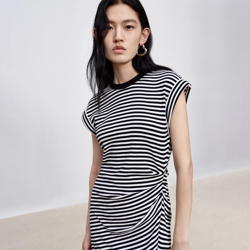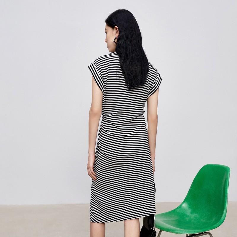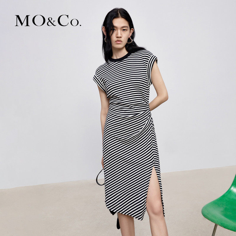 (99 New Downfall) MOCO New Pinstripe asymmetrical one-piece dress Flying sleeves Cut Open Fork Hollowed-out Dress Woman-Taobao
