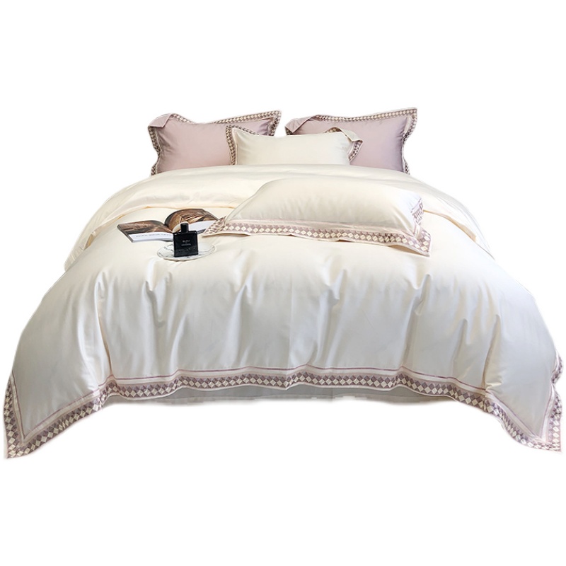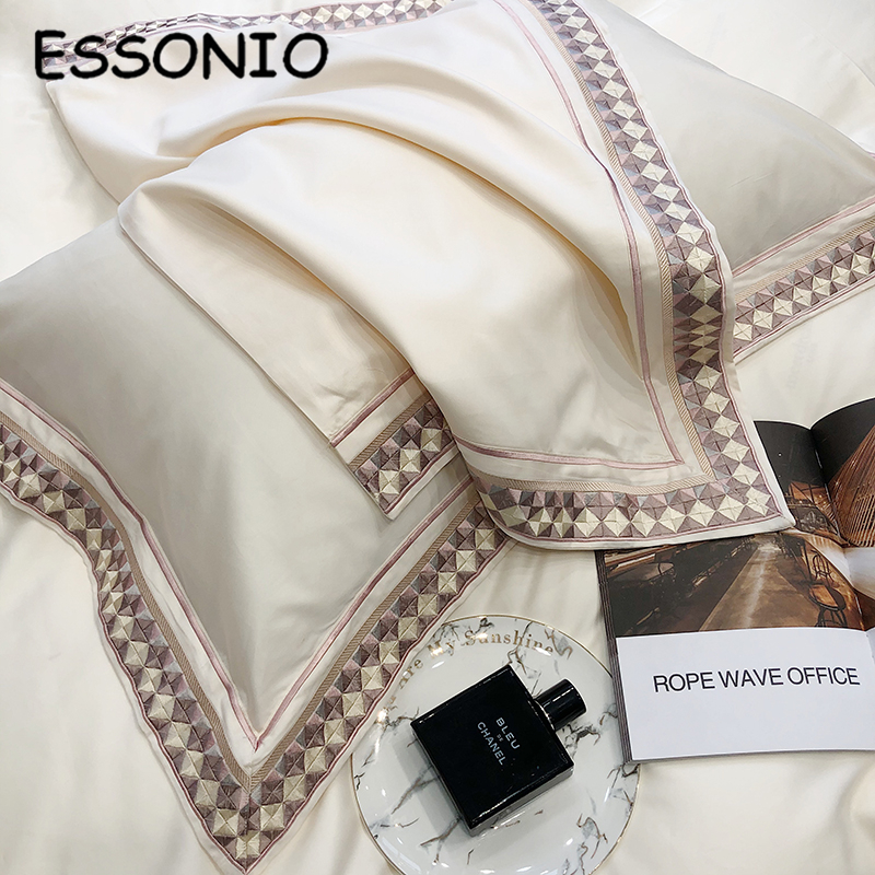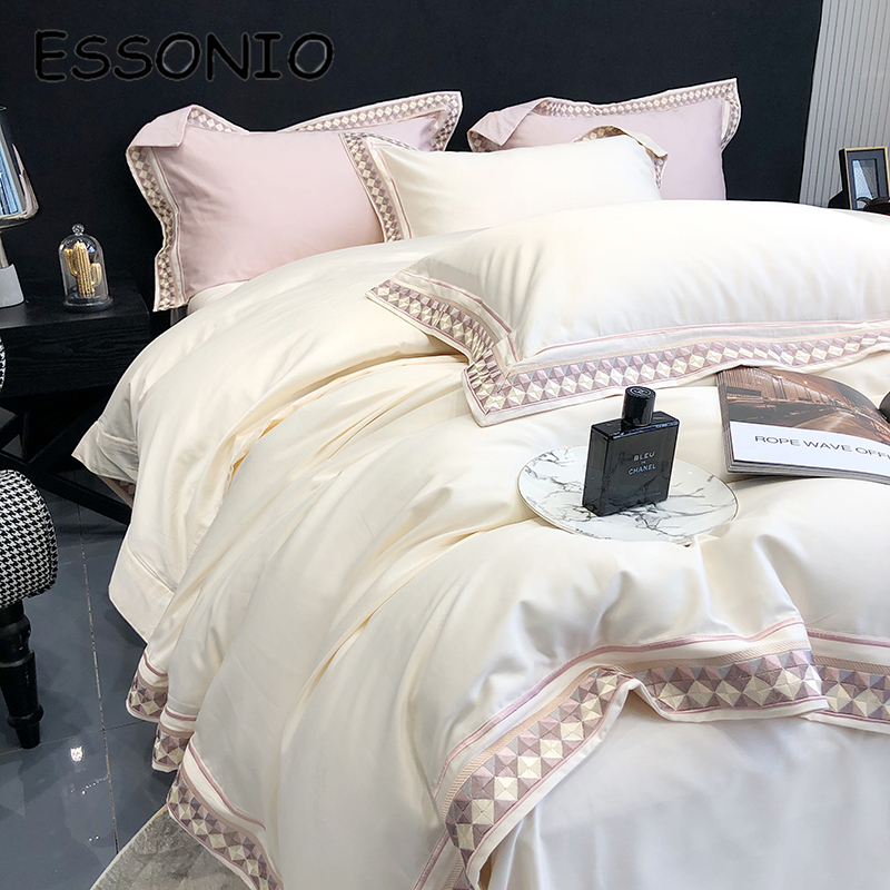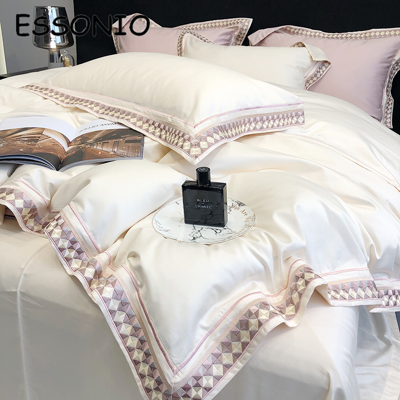 ESSONIO Light Luxury Cotton Four Pieces of Simple Pure Cotton Satin Embroidery Bed with Bed
