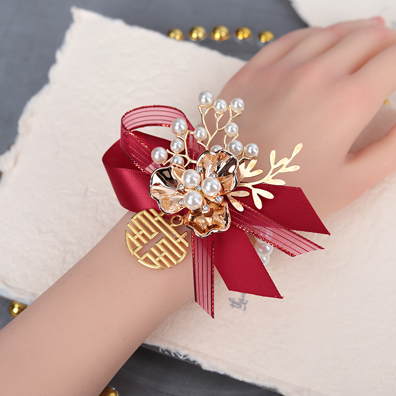 Champagne wrist flower-pearl chain-linked red wrist flower-pearl chain-colored wrist flower-strap with red wrist flower-strap with red brooch a appellation champagne breast flower a appellation red