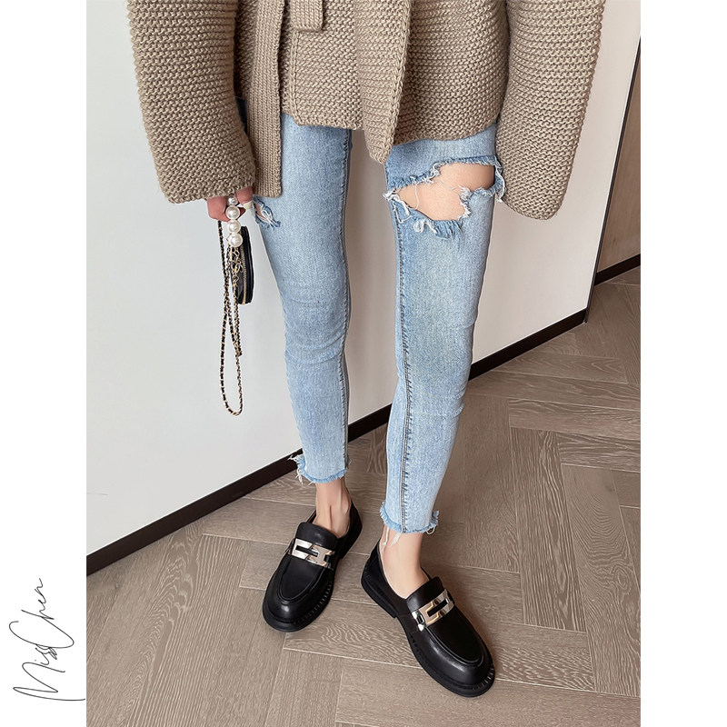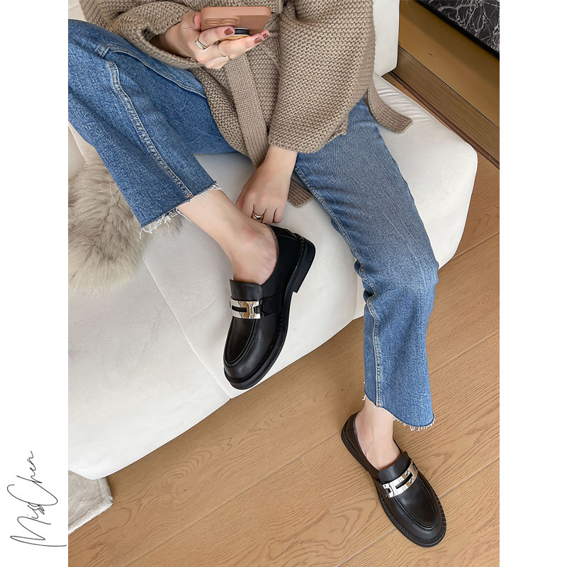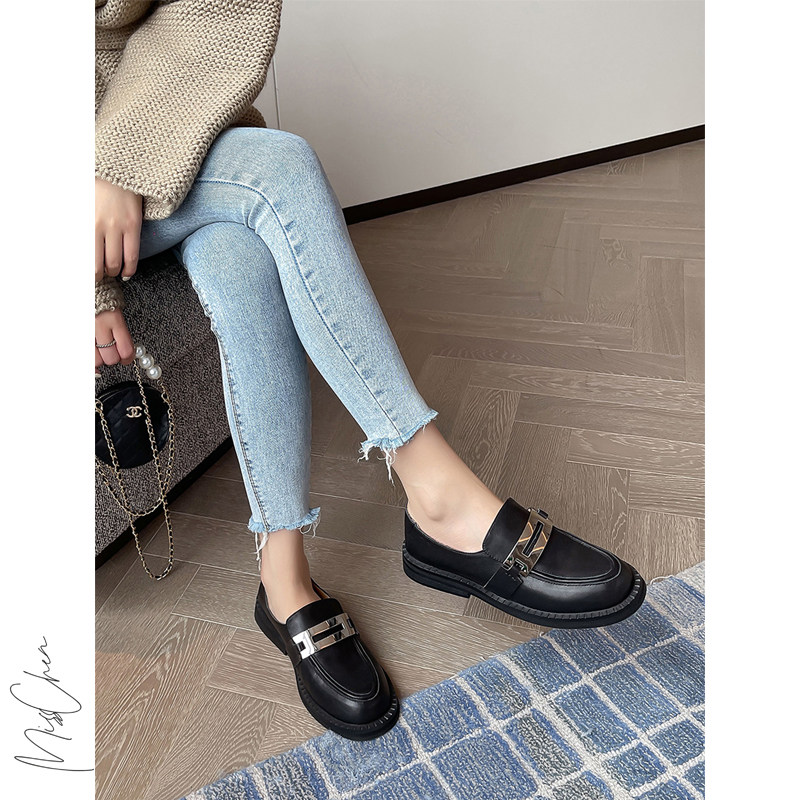 (Miss Chen) Cool Miss~ Thick soles increase British style round toe metal buckle flat bottom small leather shoes for women