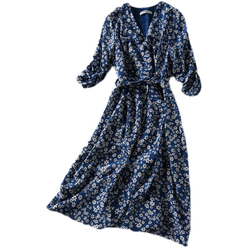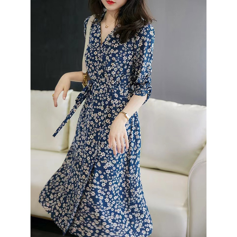MAJE MANTAS mulberry silk floral tea break dress women's French blue silk dress 2022 new
