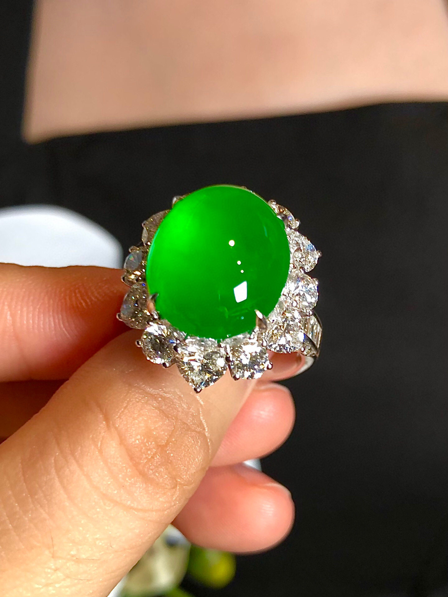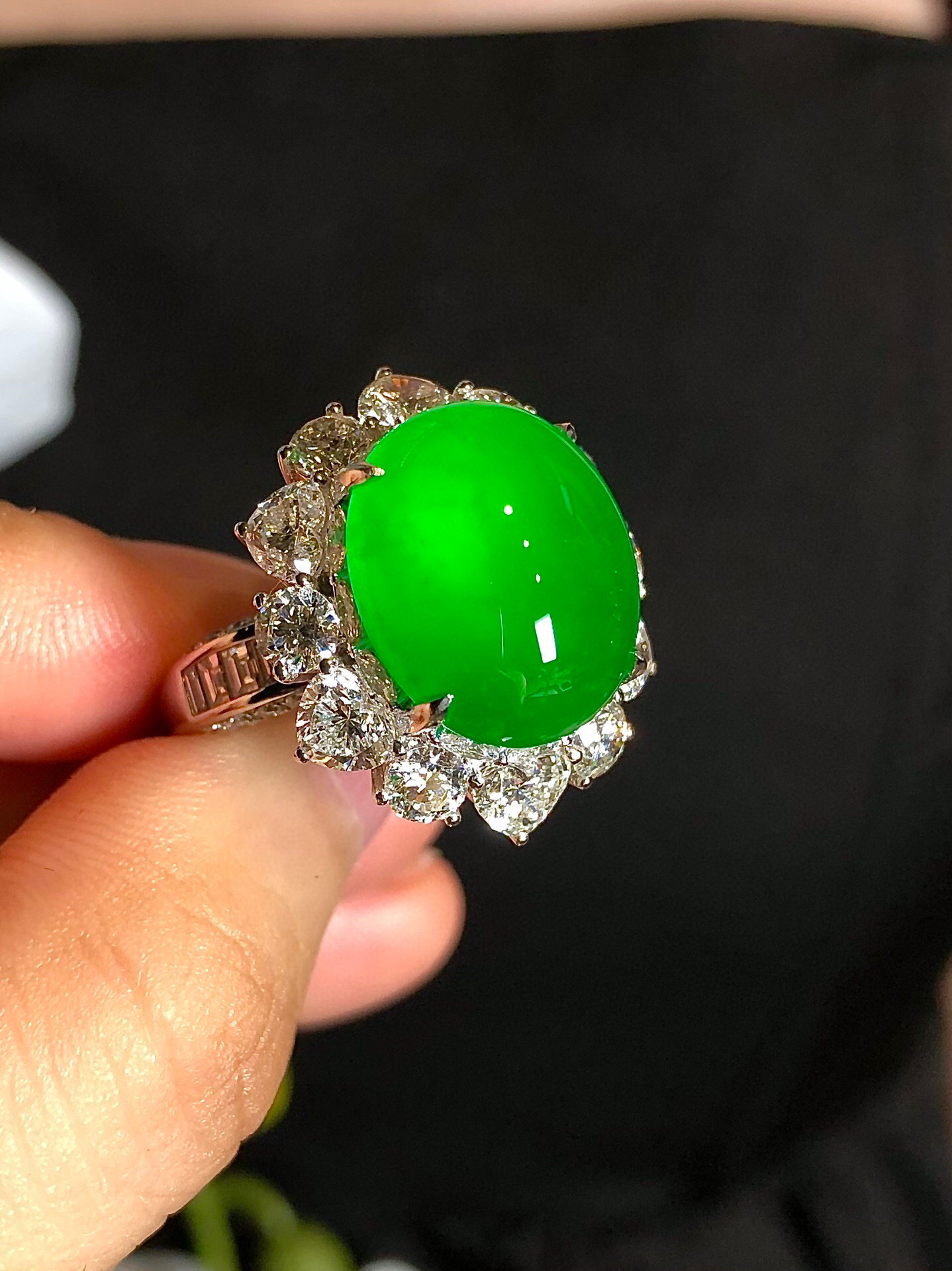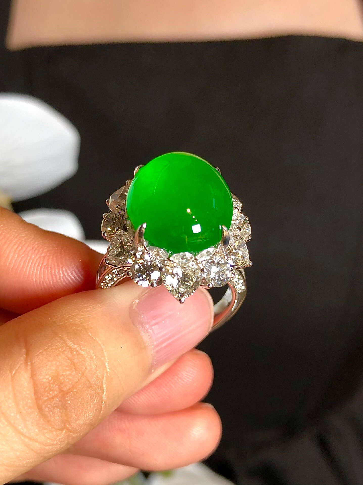 Natural Burma A - cargo Emerald Ring High Ice Seed with Yangyang Green Egg Noodle 18K Gold Mounted Jade Pearl