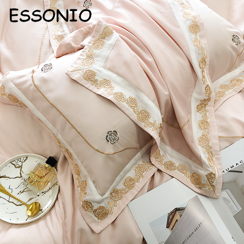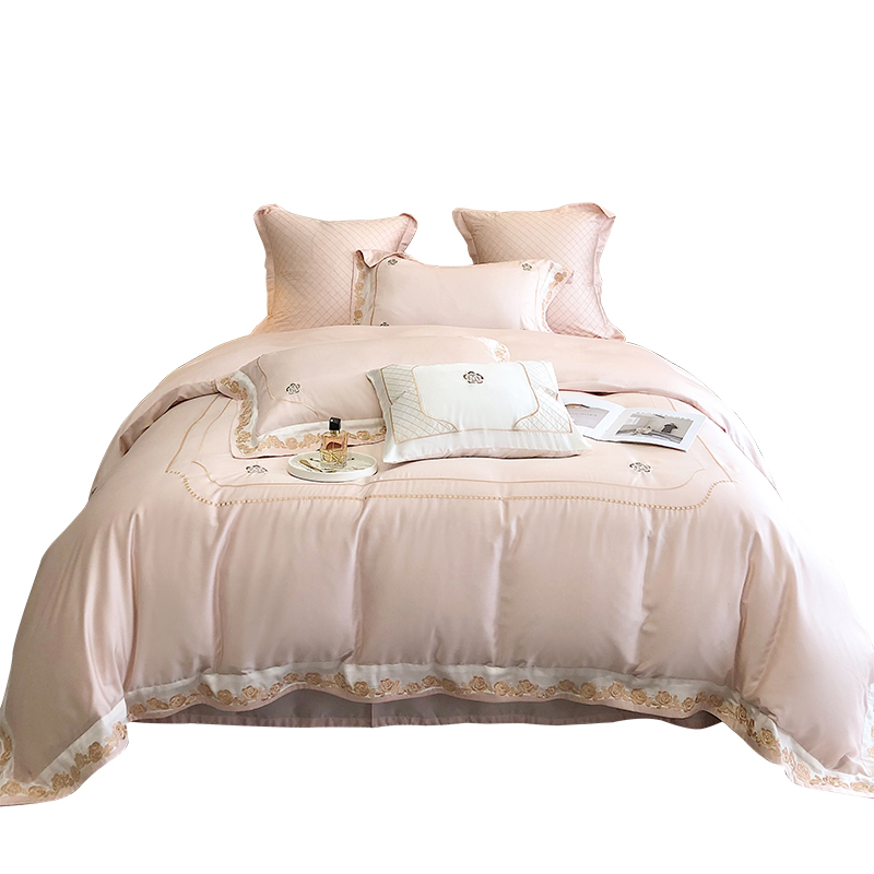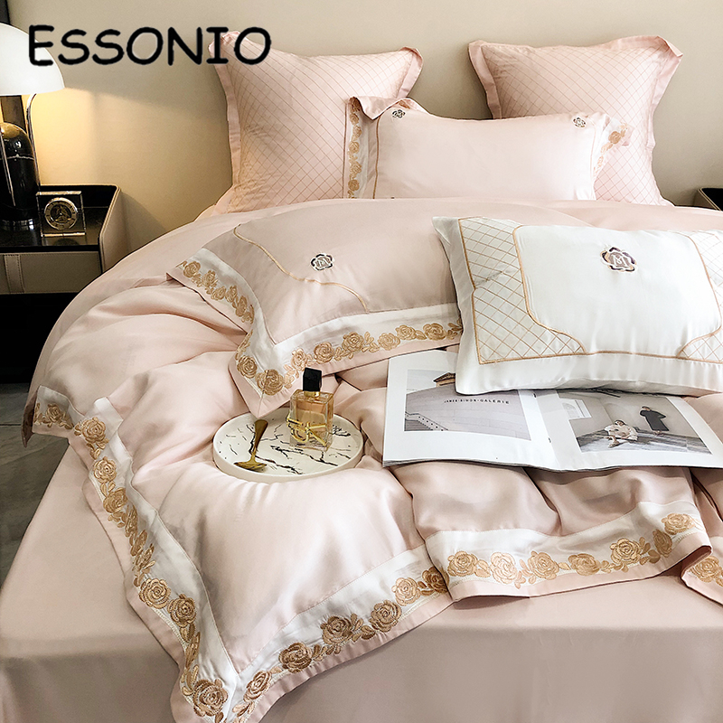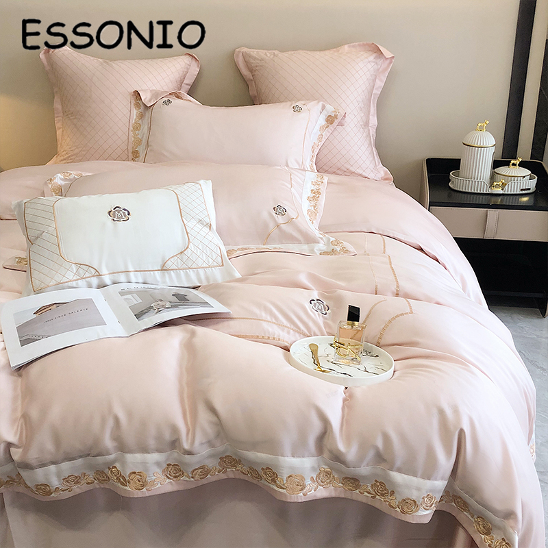 ESSONIO summer light luxury Lanjing tencel four-piece set simple wind ice silk rose embroidery quilt cover bedding