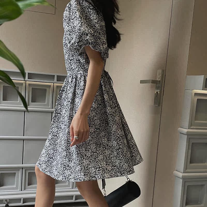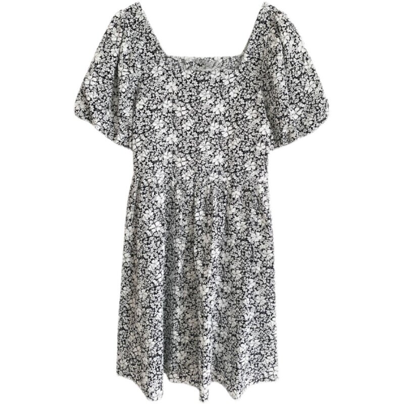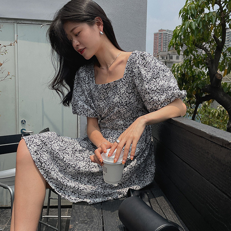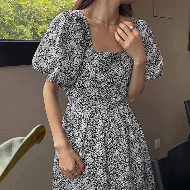 Maje mantas 2022 new square neck floral dress small puff sleeve A-line skirt high-quality