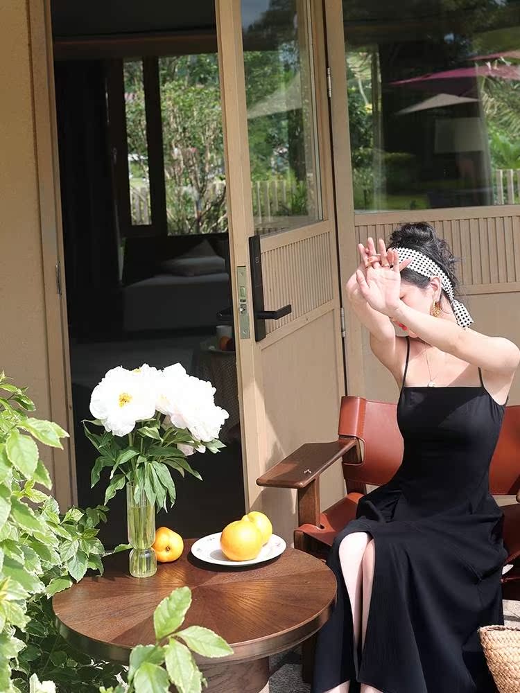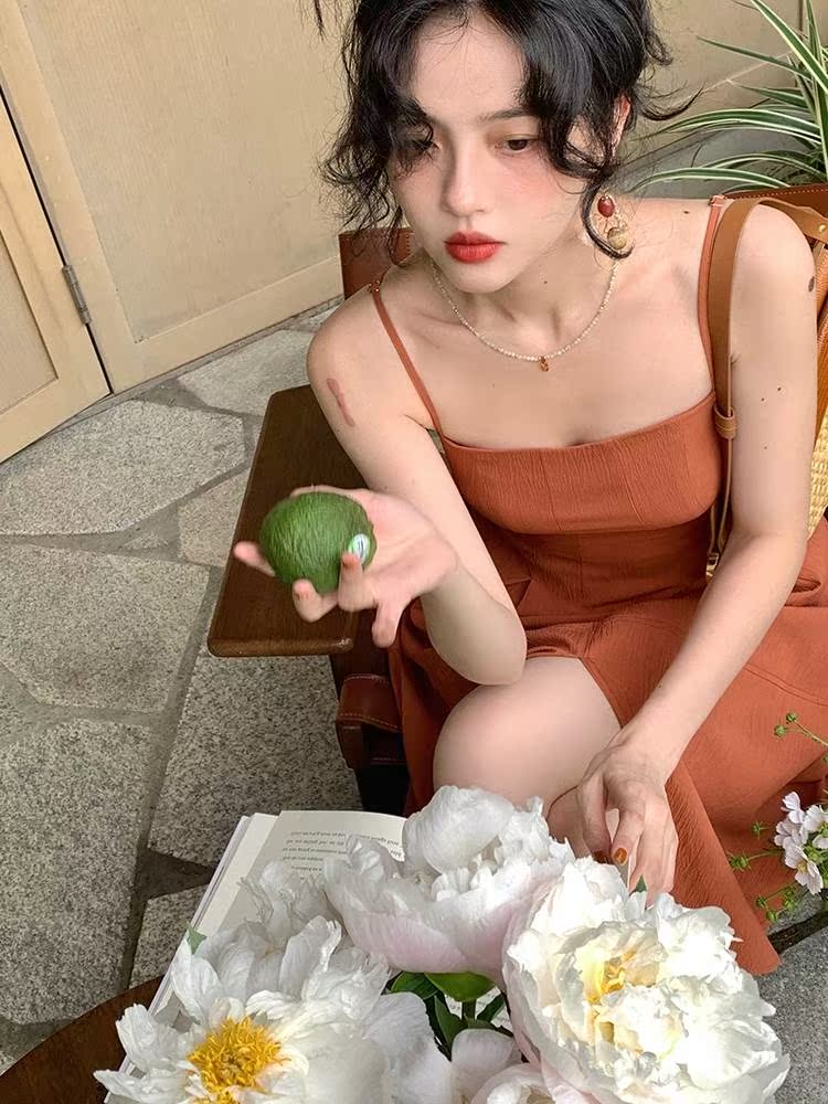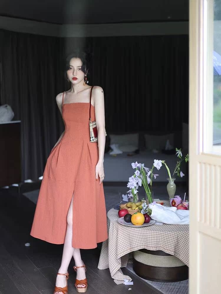 Wine Afternoon Homemade Style Retro 2022 Summer Fold Open Fork Harness Foreign Dress Cashew Slim Mid-Length Skirt Woman