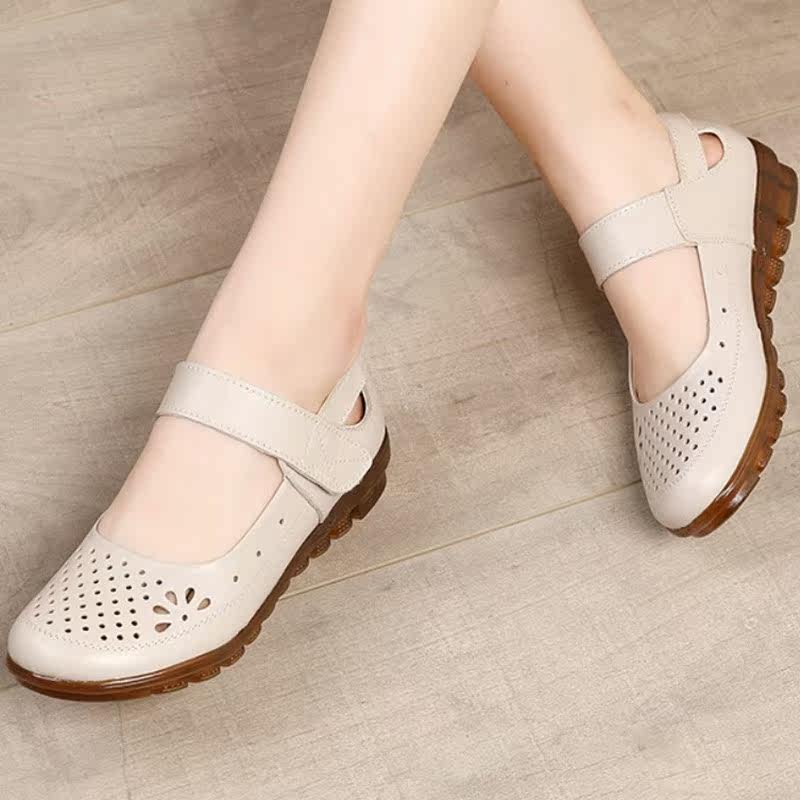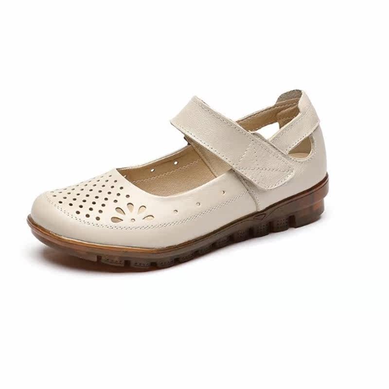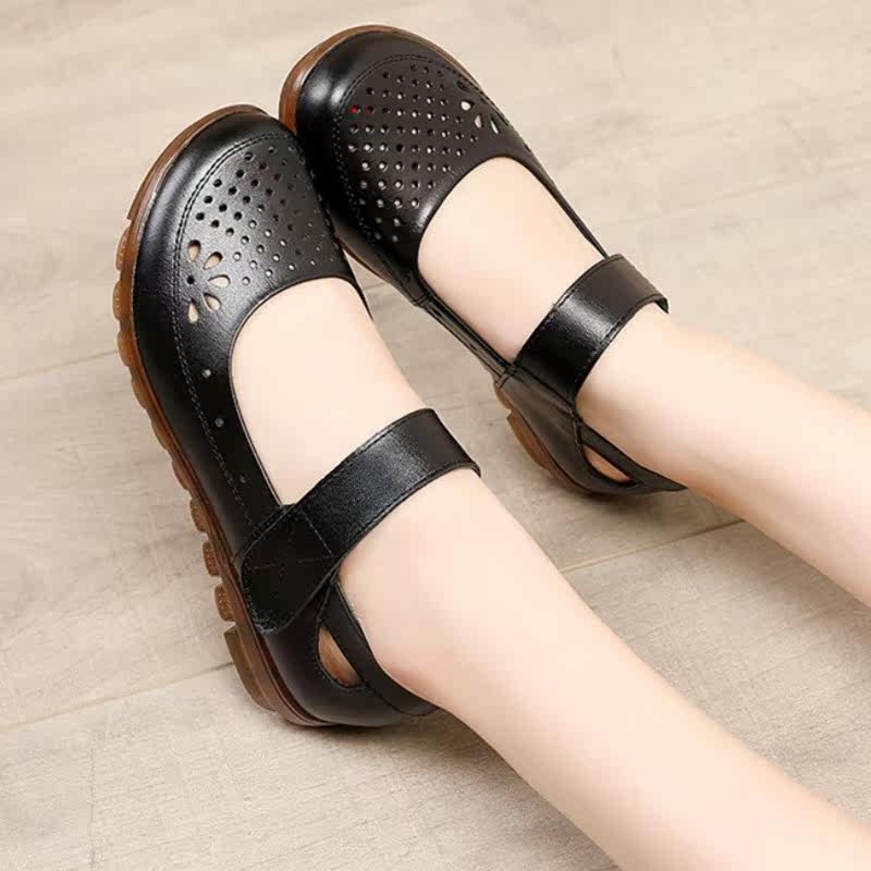Tendon bottom mother shoes leather soft bottom spring autumn summer flat bottom middle-aged and elderly hole shoes non-slip hollow leather shoes women