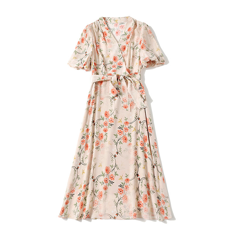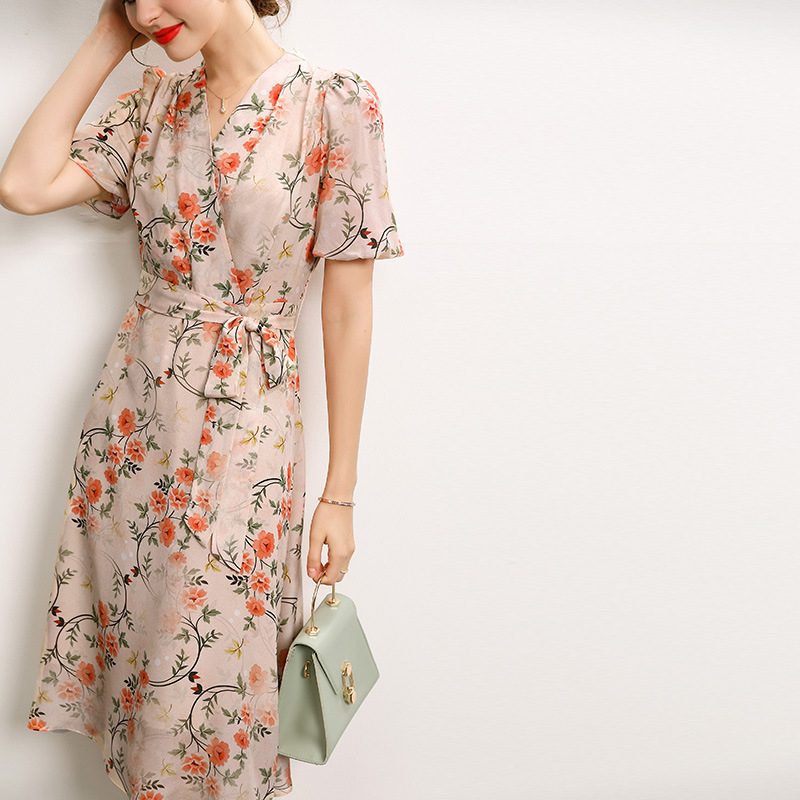 MAJE MANTAS French dress silk V-neck tie waist fairy print mulberry silk A-line skirt