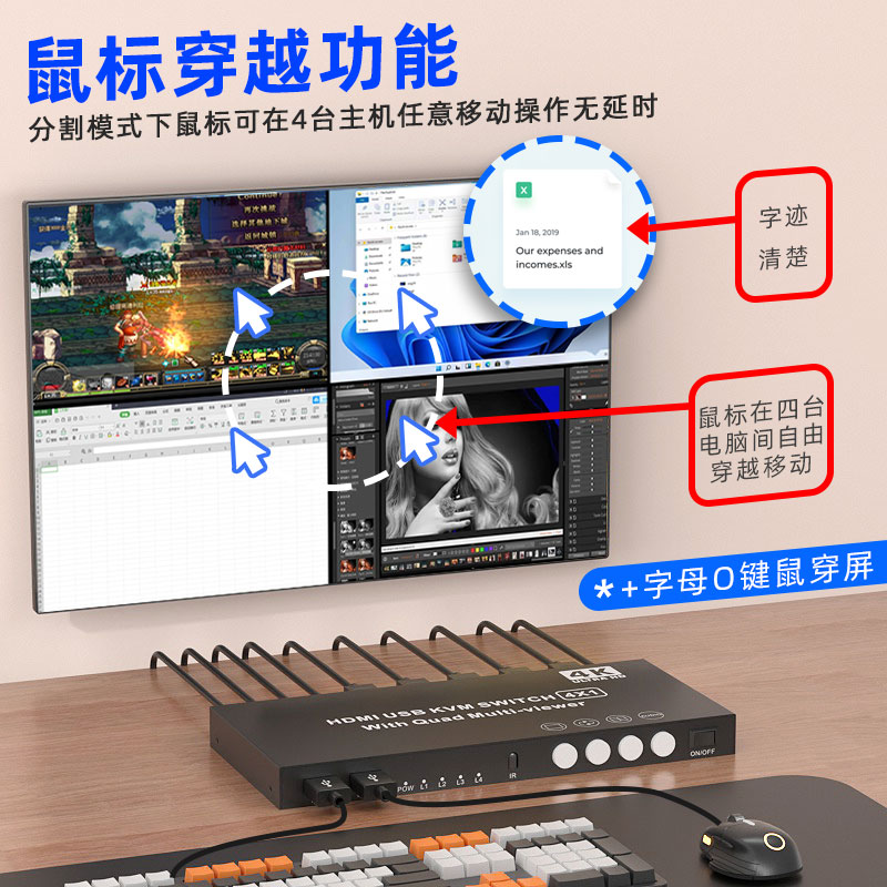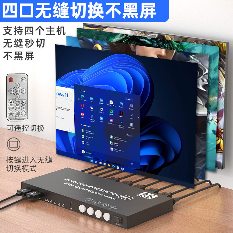 Saiki HDMI split-screen device four-in-one-out KVM seamless switcher 4K screen picture divider 4-port KVM computer USB key mouse synchronous all-in-one 4-in-1 out of the DNF game switcher -