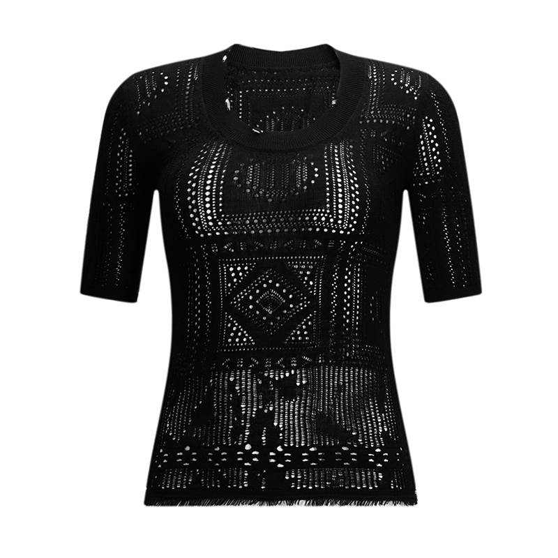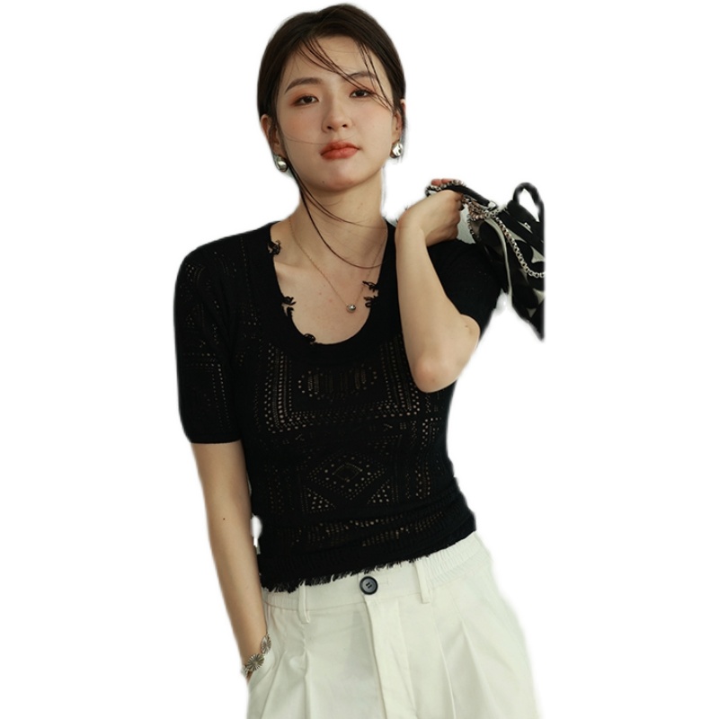 Port Wind Retro Hollowed-out Ice Silk U Collar Knit Short Sleeve Blouses Woman 2022 Summer Thin Air Conditioning Shirt Inside a T-shirt