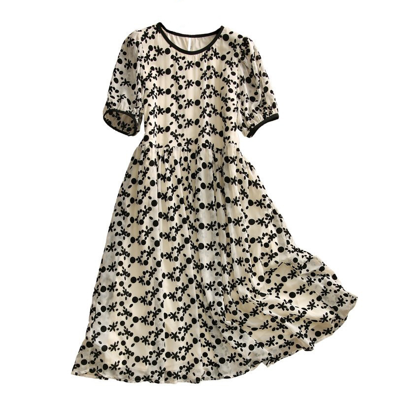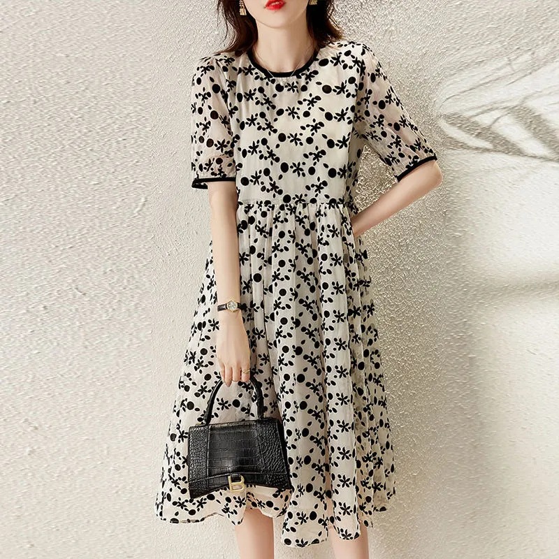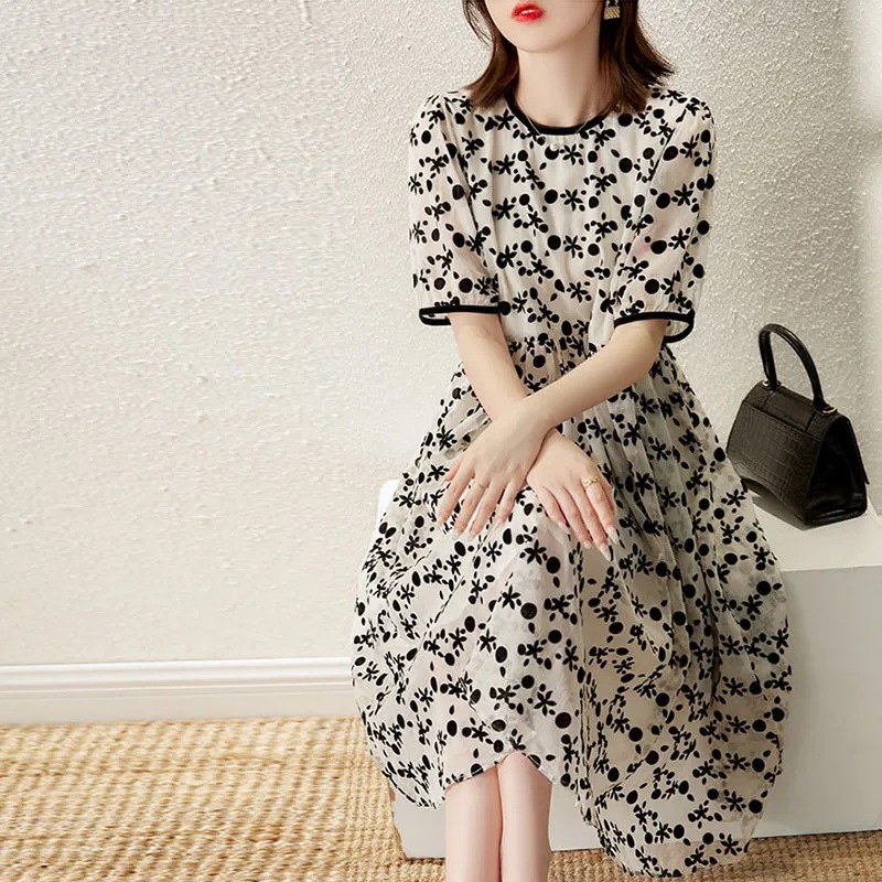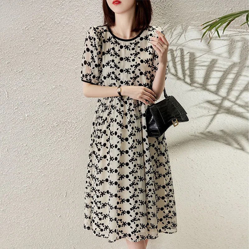 Maje mantas series 2022 summer new floral short-sleeved round neck dress temperament waist slimming retro