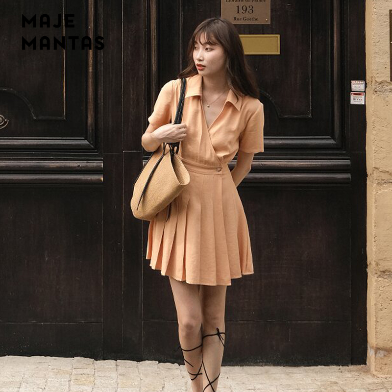 MAJE MANTAS French retro lapel pleated short-sleeved dress women's summer style gentle wind high waist
