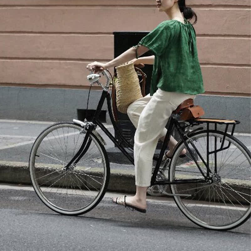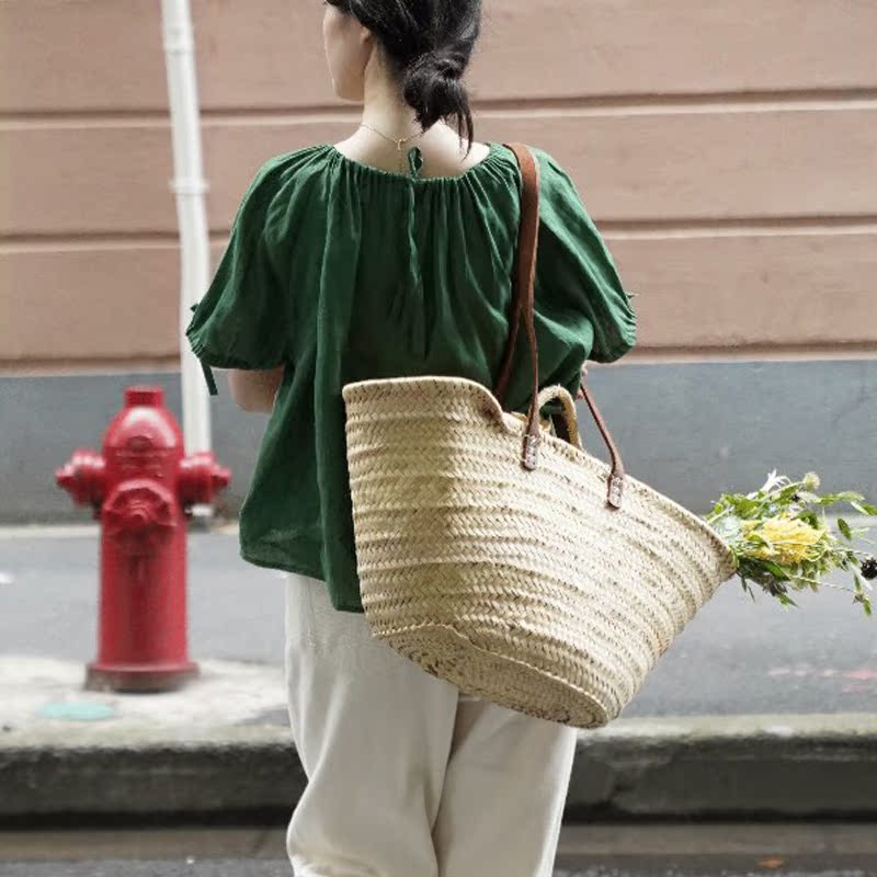 MAJE MANTAS French Retro Adjustable Linen Loose Women's Short Sleeve Shirt Simple Pleated Chic Top