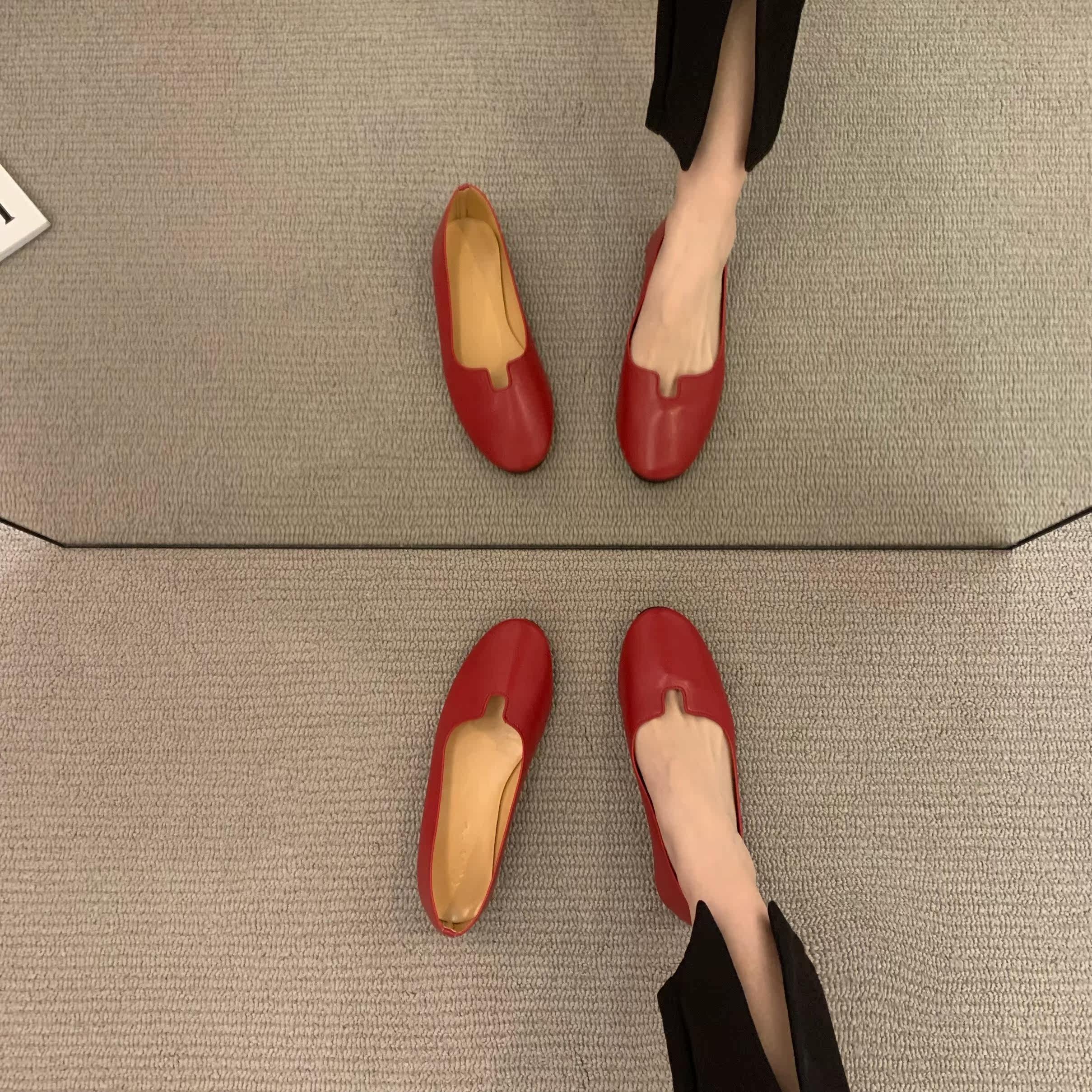 ITSK single shoes women's round head shallow mouth flat bottom evening wind gentle all-match red beanie shoes scoop shoes