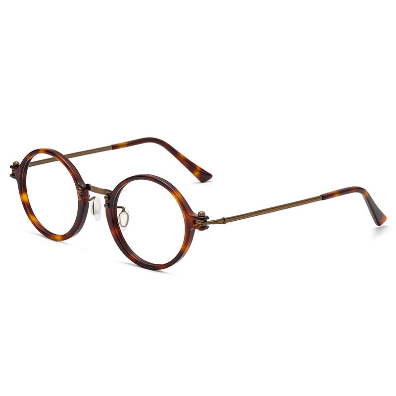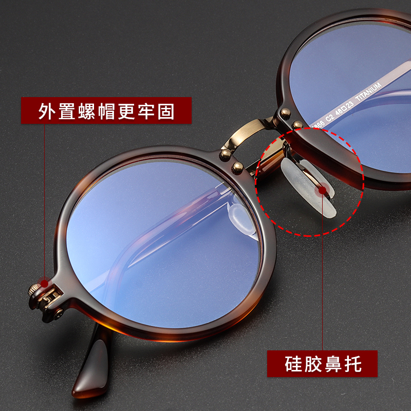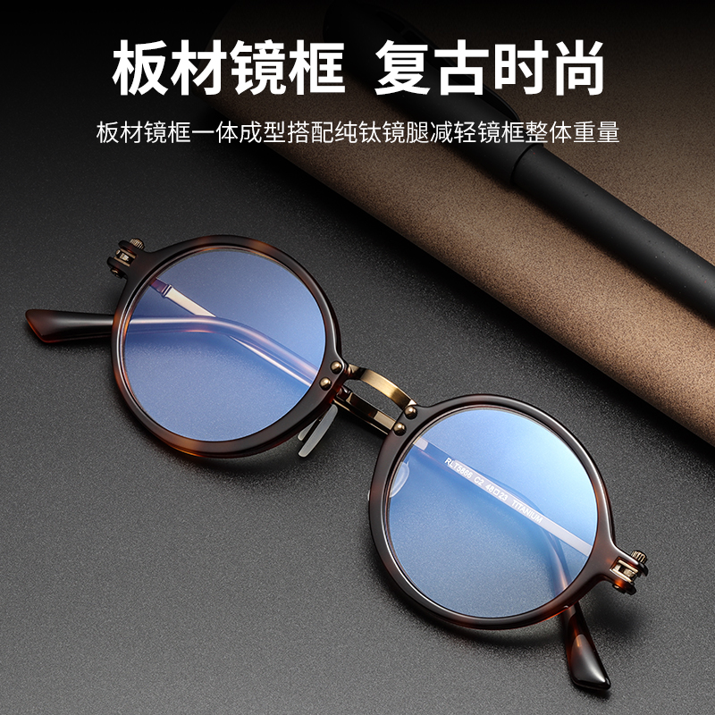 Ultra-light titanium retro glasses frame with proximate blue-colored classic round frame glasses