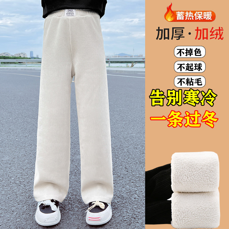 Girl Plus Suede Pants Autumn Winter New CUHK Children Casual Straight Drum Thickened Cotton Pants Winter Sweatpants Children Wide-legged Pants-Taobao