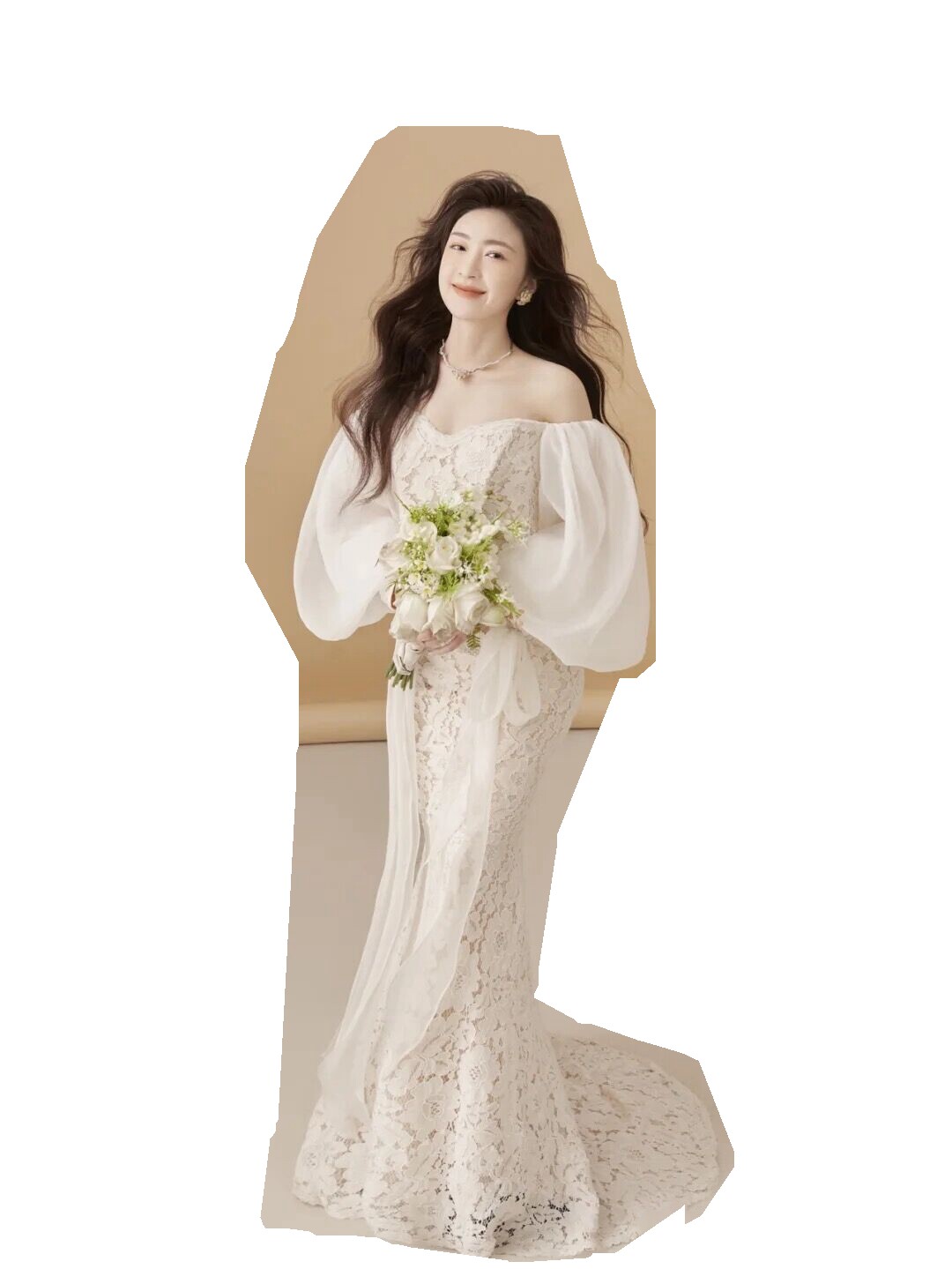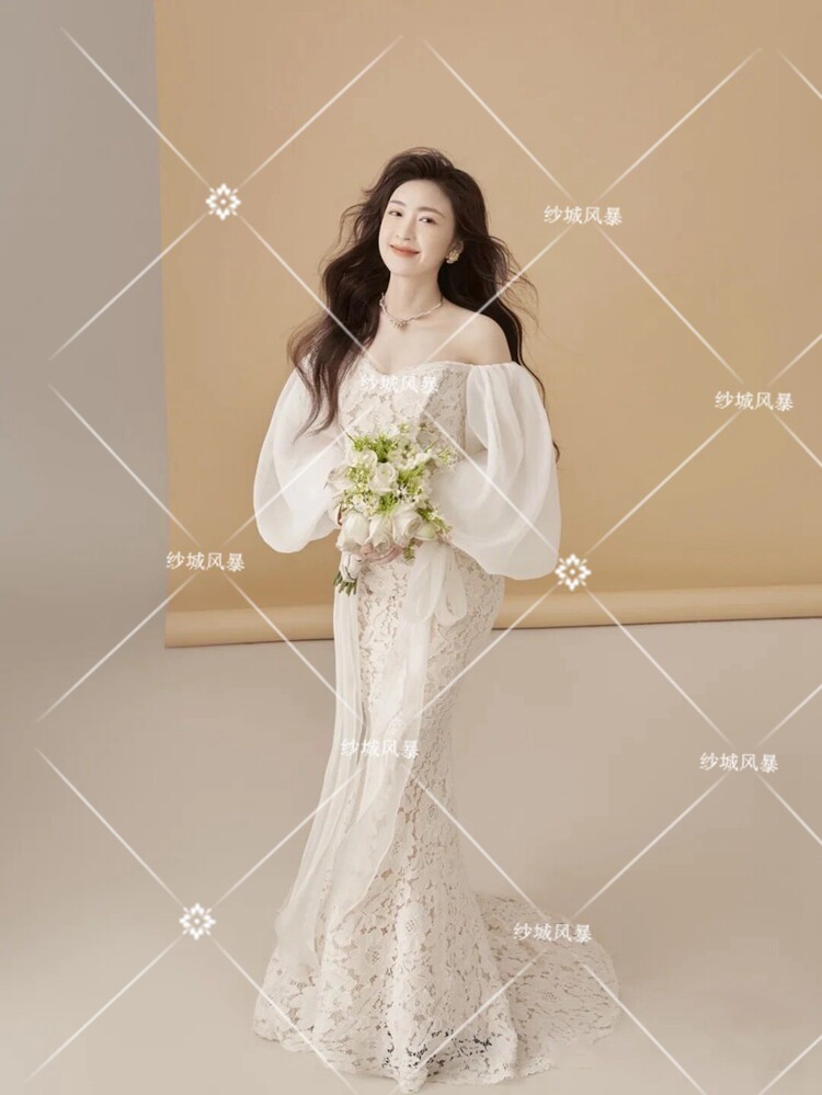 Studio wedding dress theme white lace mermaid clothing photography photo shoot puff sleeve retro simple tube top dress