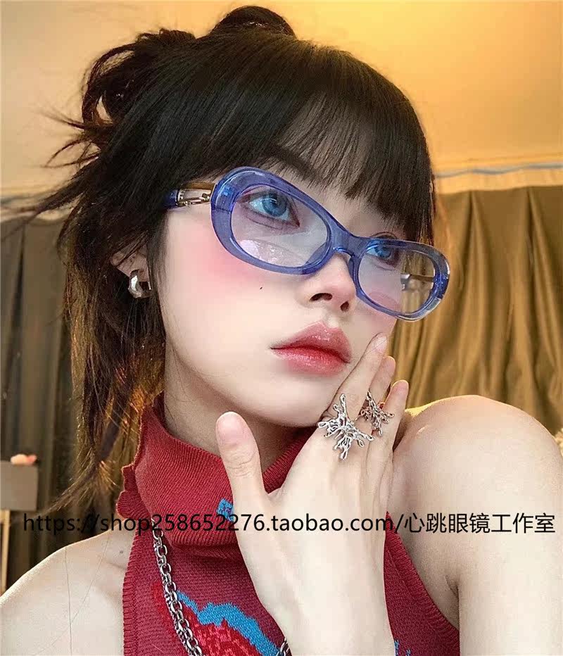 New Korean version of the joint flat oval blue sunglasses climbing buttonhole sunglasses ins net red with the same concave shape
