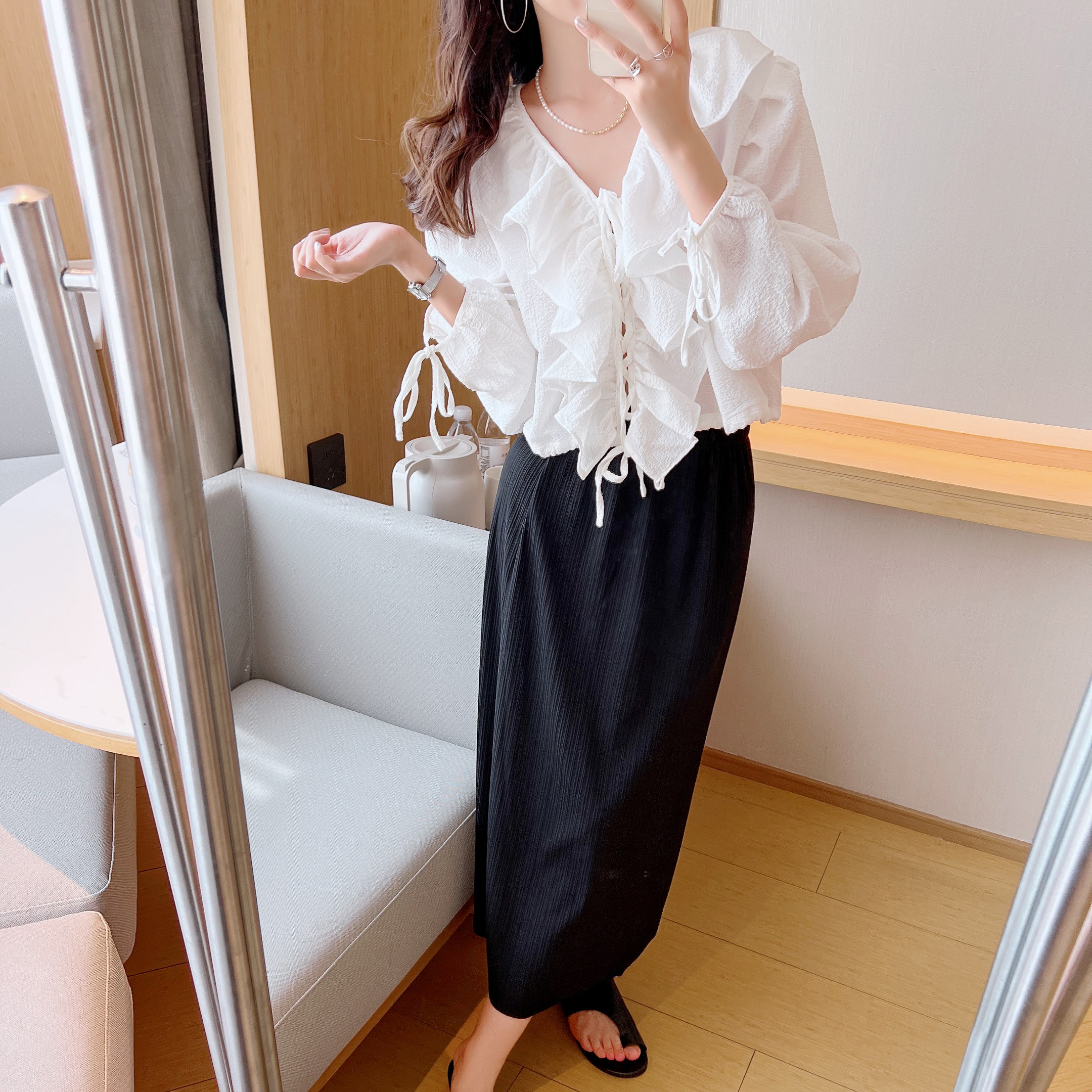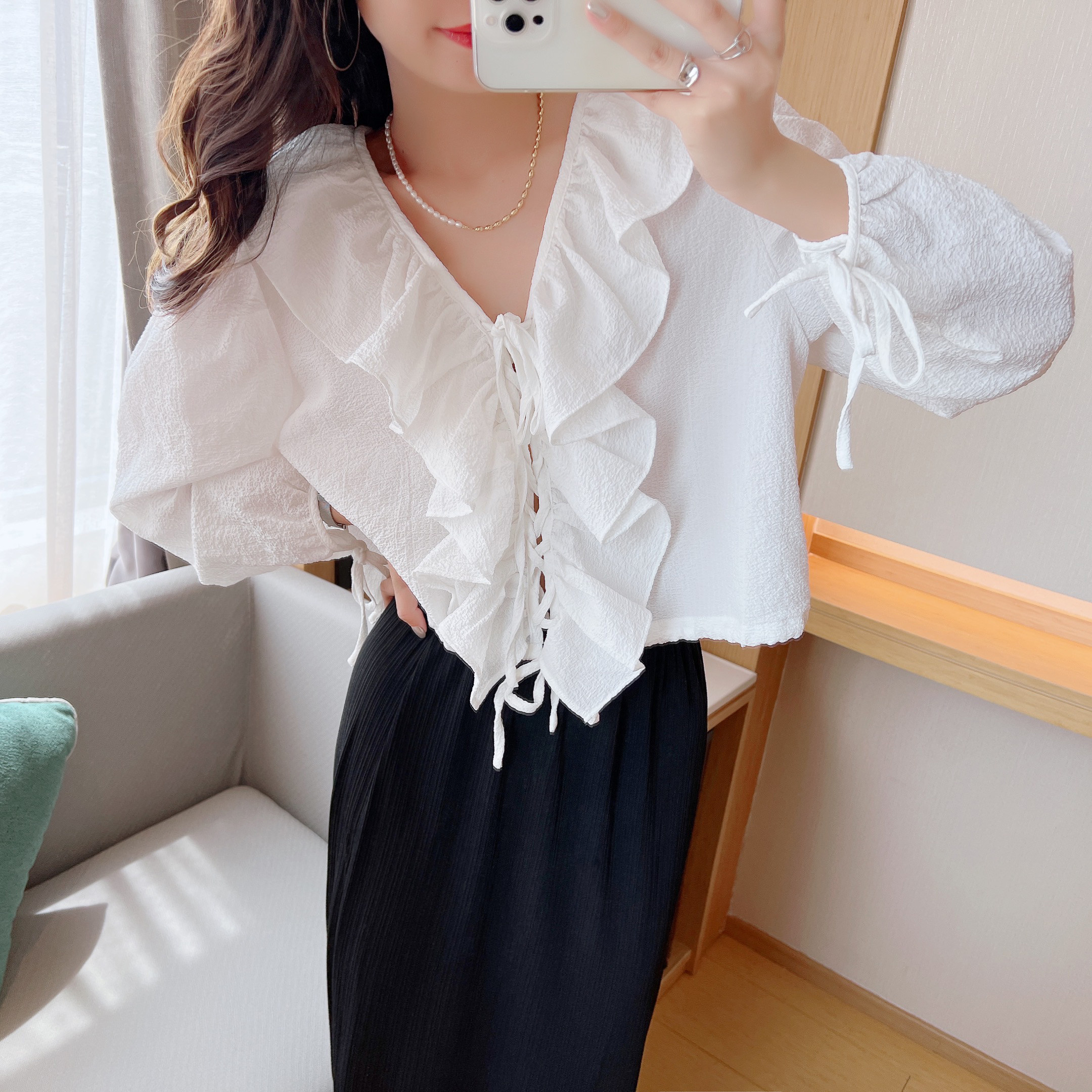 Taobao model photography hotel scene shooting selfie style headless style women's T-shirt sweater bottoming shirt net red style
