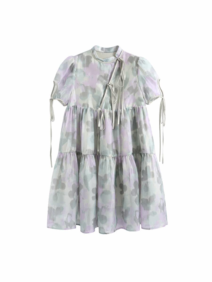 ECCE HOMO 22SS New Chinese style stand-up collar puff sleeve doll skirt slanted sweet lace bow gauze skirt