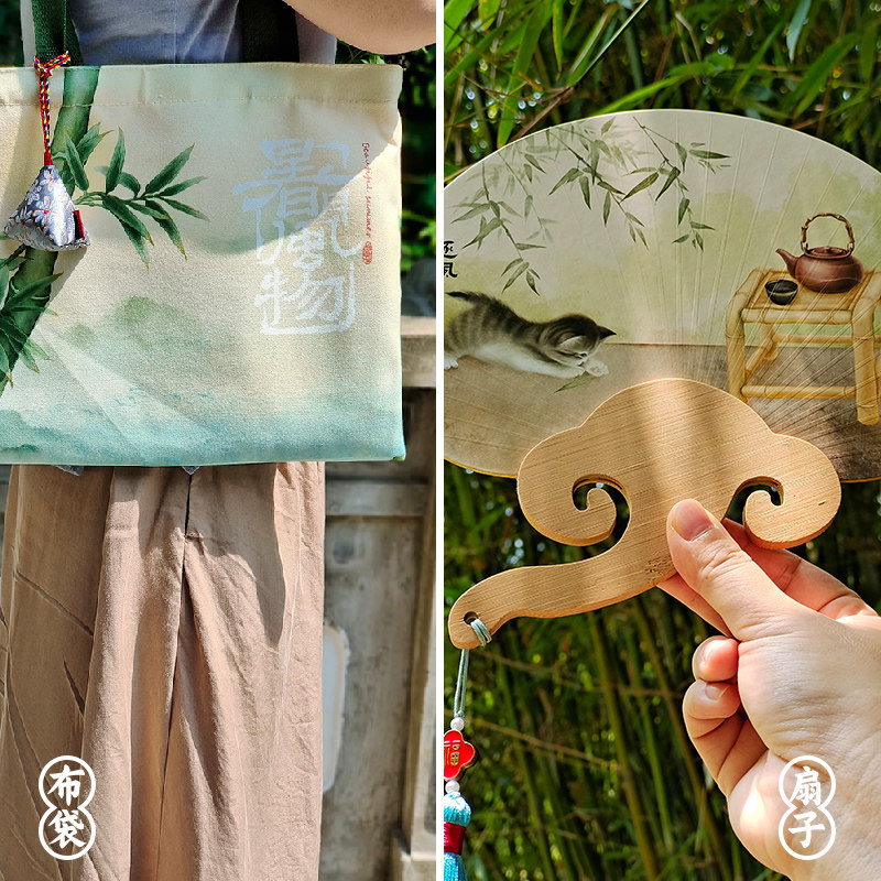 Original "summer moon scenery" Chinese ancient style round craft fan natural sachet canvas bag gift box customization