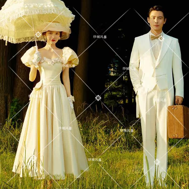 Photo studio French light retro theme clothing location photo couple photo short dress satin flower color wedding dress