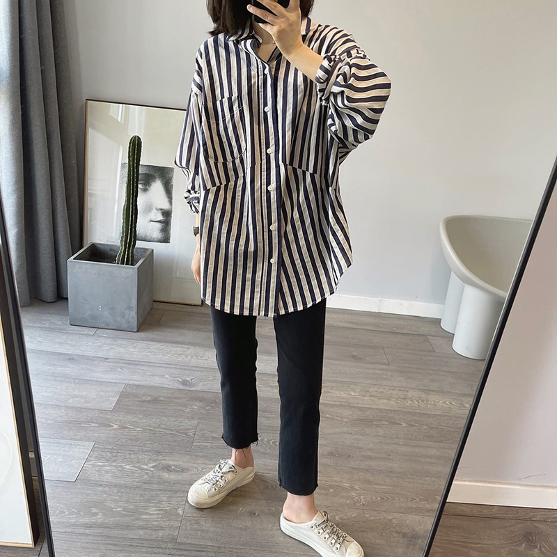 Early spring new irregular vertical stripes loose long sleeve shirt female Han Bu Bao commuter and collar sun shirt