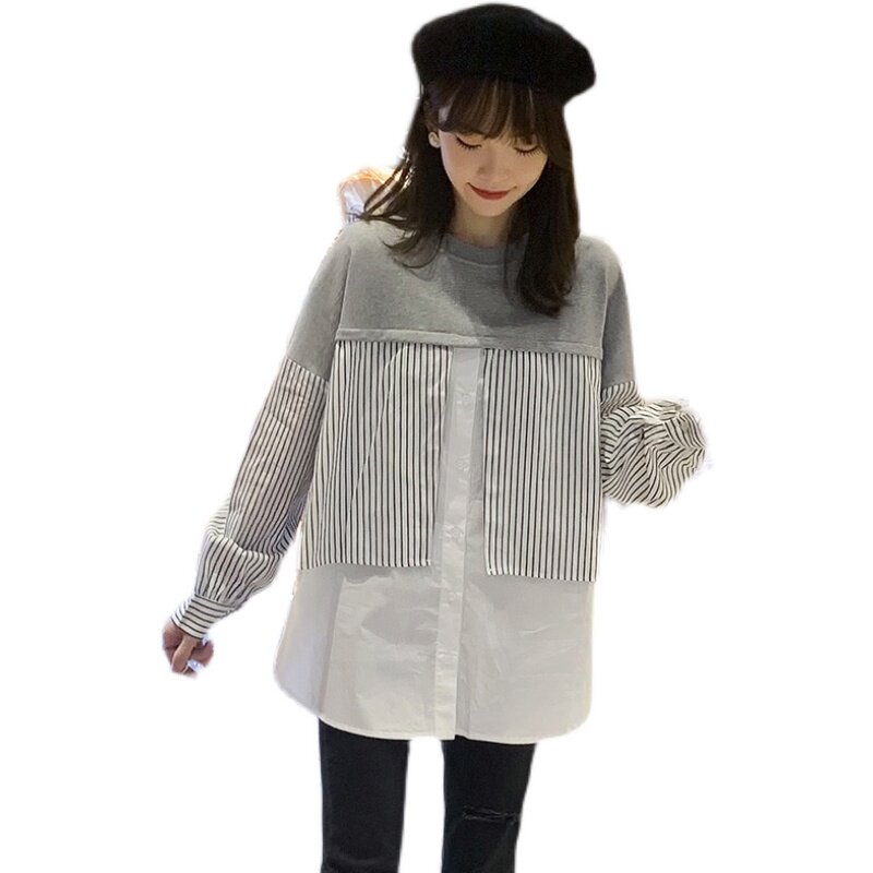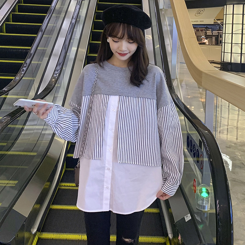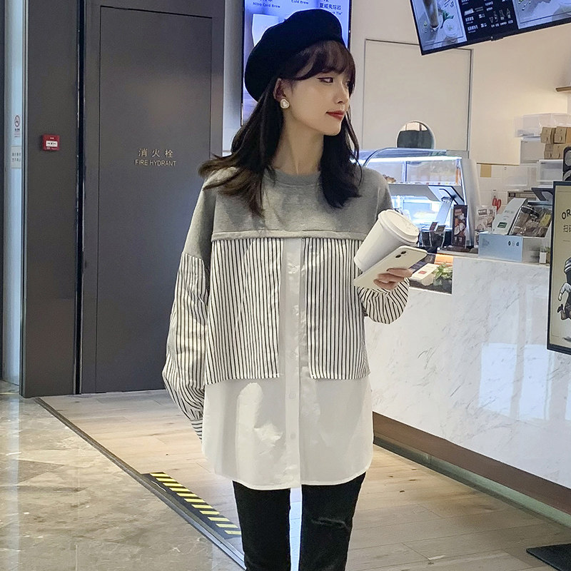 Pregnancy Woman Dress Spring Clothing Fake Two Splicing Stripe Long Sleeve Shirt Fashion Korean Version Online Red Blouse Spring Autumn Pregnant Woman T-shirt-Taobao
