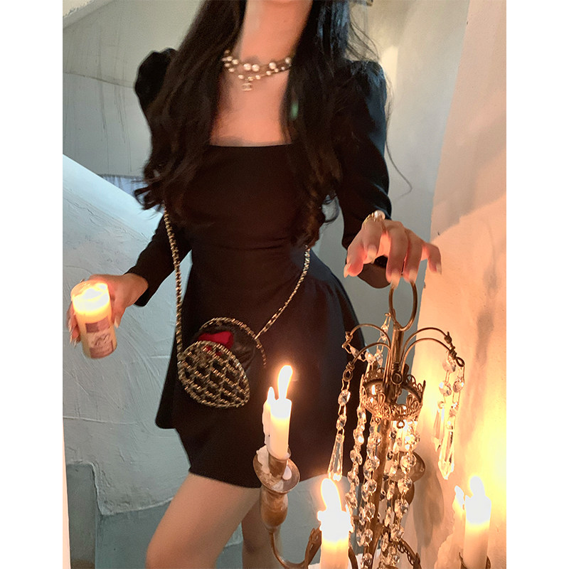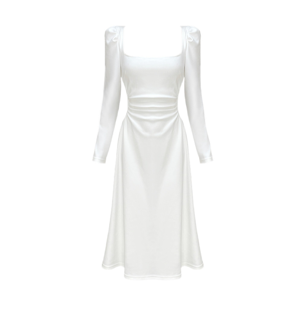 From a white square collar with a dress 2022 long sleeves folds a character to a design sense style tea hysteria skirt-Taobao
