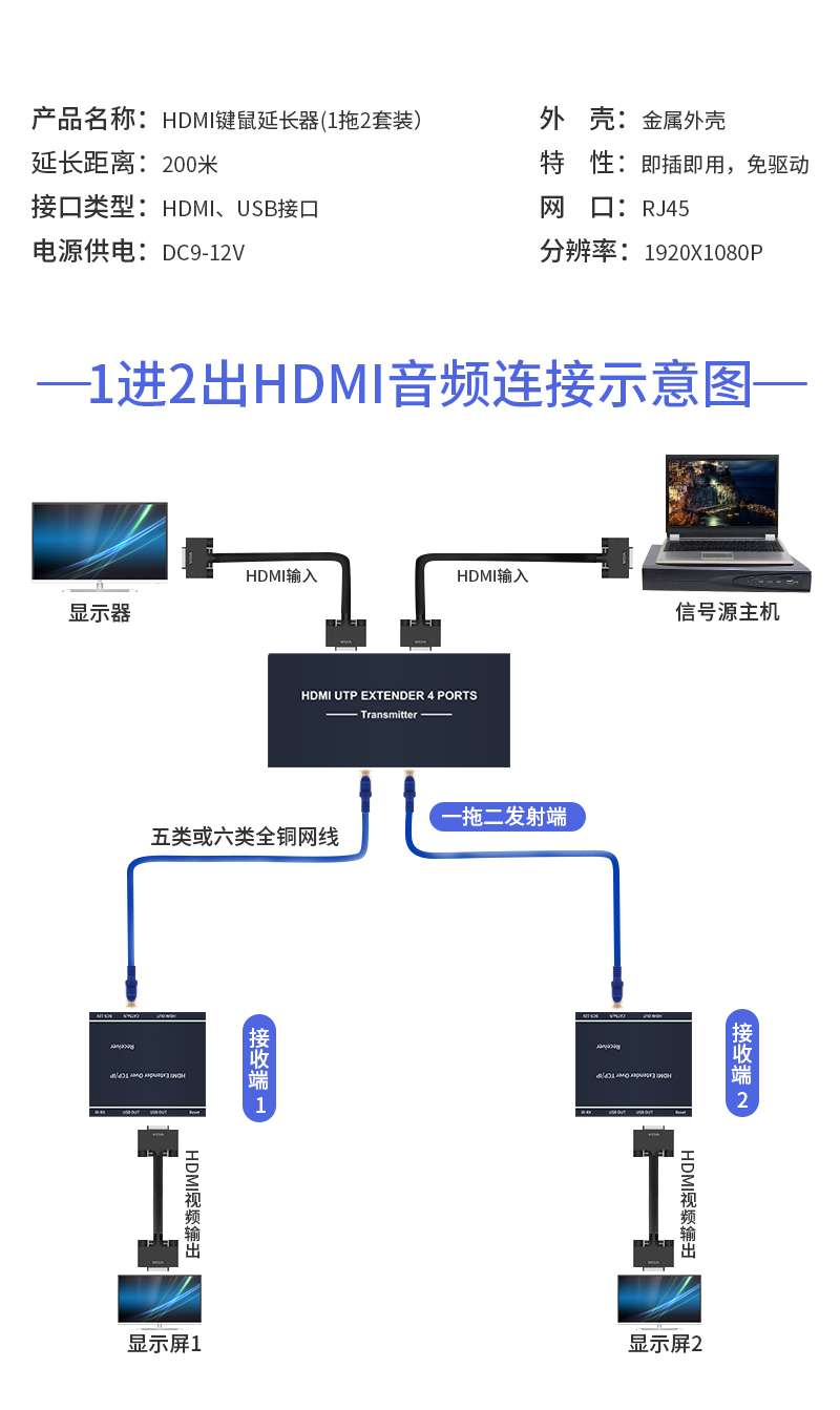 HDMI cable allocates transmitter 200 m one-on-one 2 4 8 out of USB keymouse engineering level