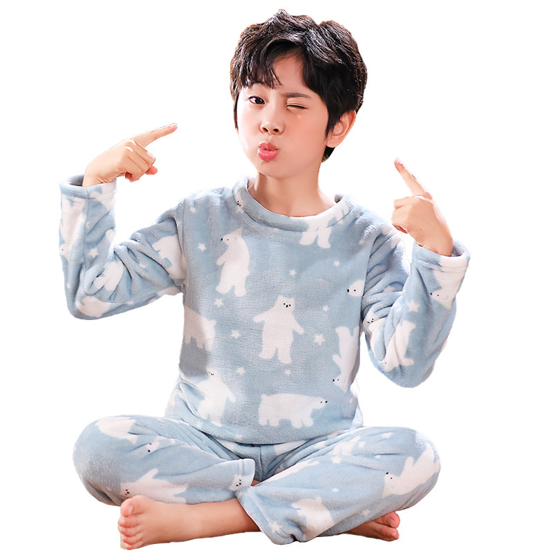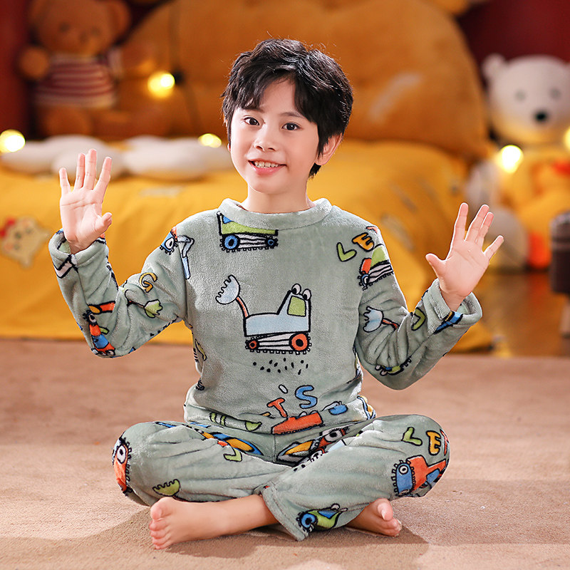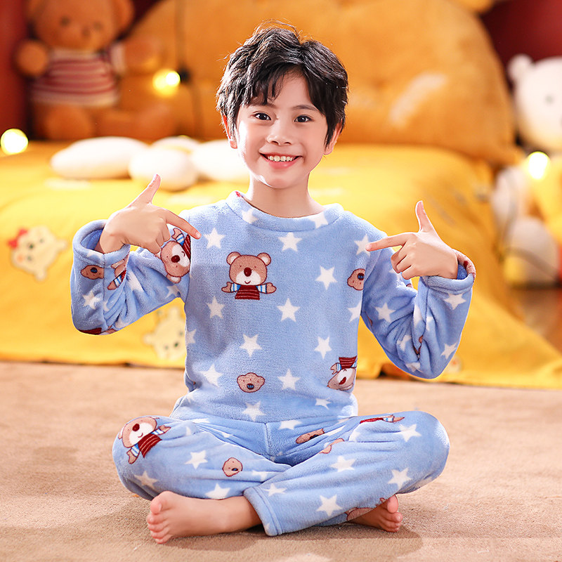 Boys and girls flannel pajamas autumn and winter children's thickening and velvet cartoon middle-aged boy's coral velvet home clothes