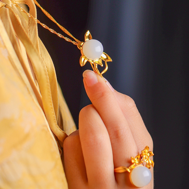 Brahflower Orchid Themed Gold-Mout Pending Xinjiang Midachi White Yu and Tian Yu Ring
