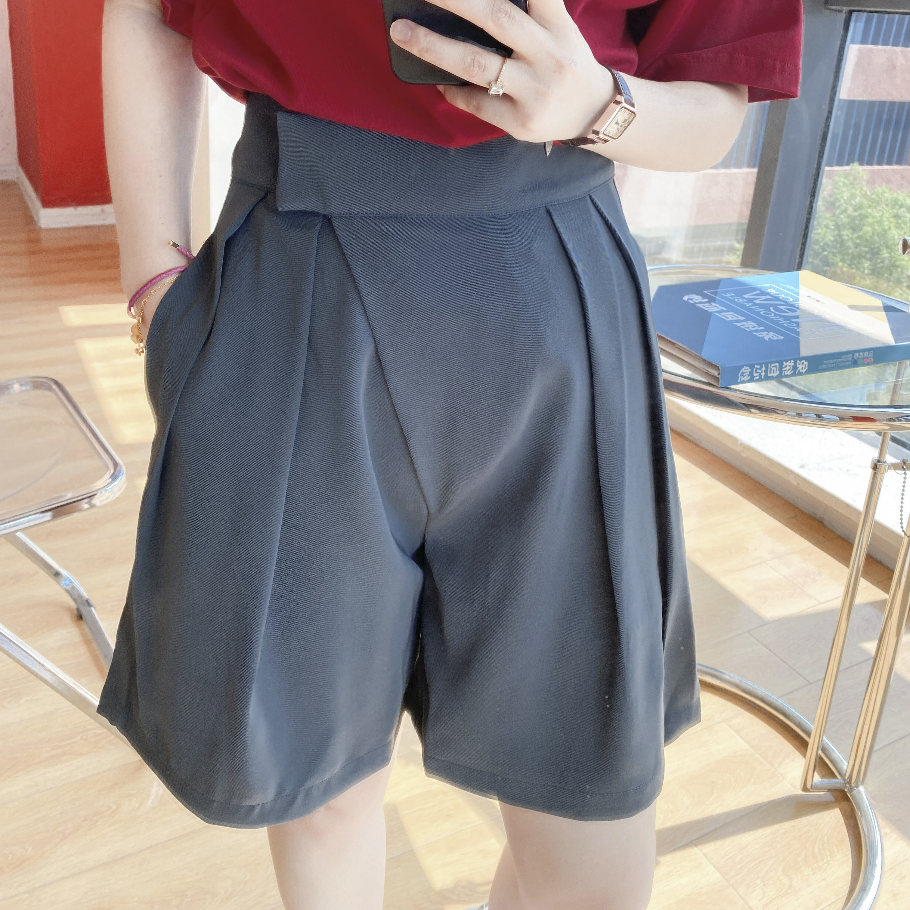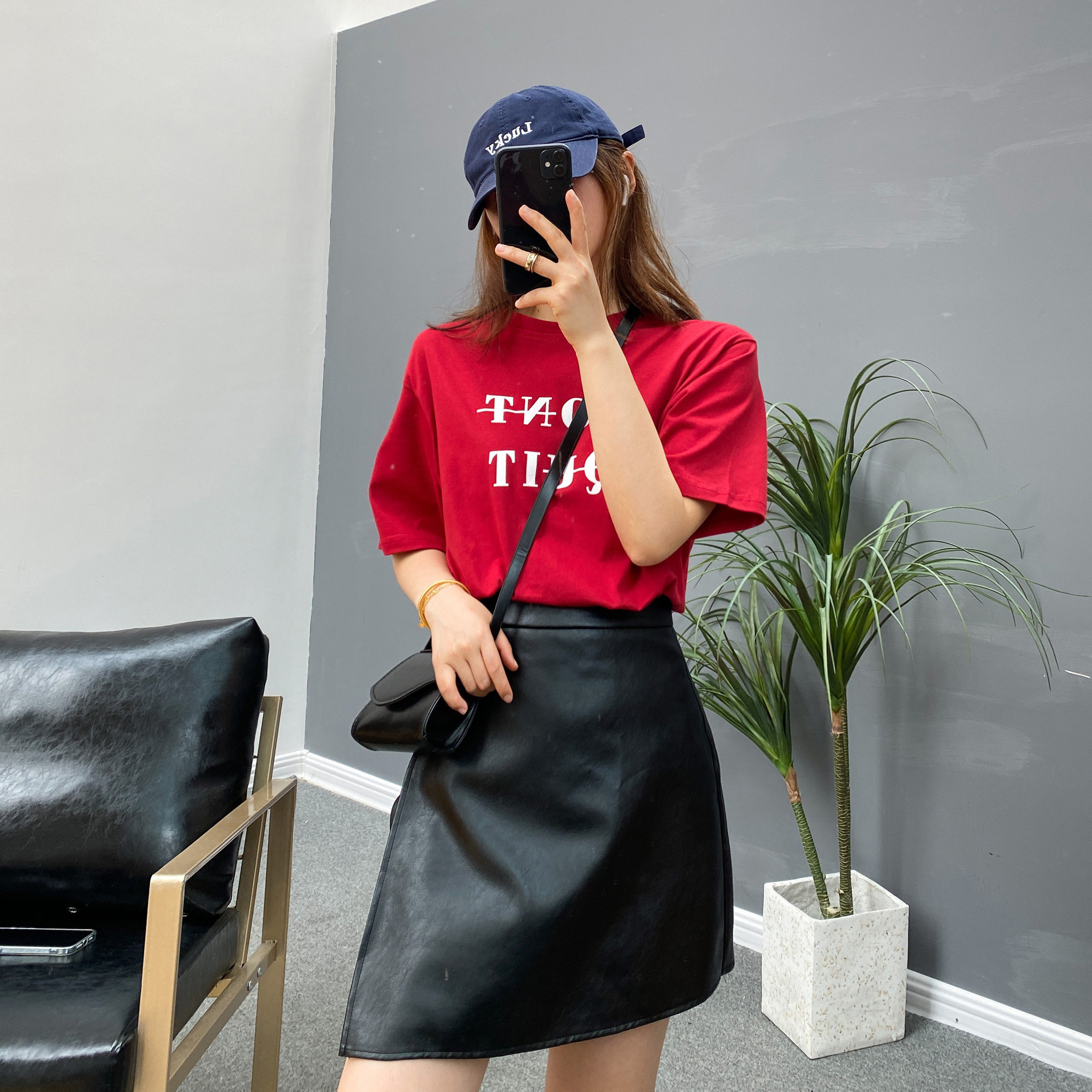 Chili red T-shirtWine red shortsGrey shortsLight blue shortsBlack leather skirtBrown leather skirtGray sun hatBrown sun hatBeige sunglassesBlack sunglasses