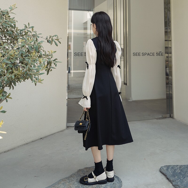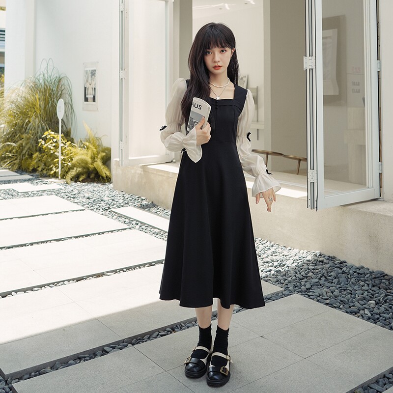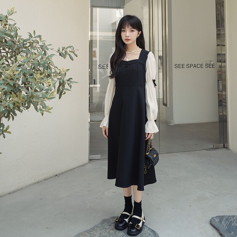 Square collar black one-piece dress fake two women early spring 2023 new Don't make nice dresses cashew slim-Taobao