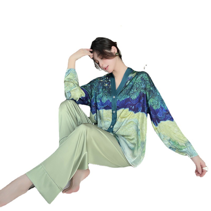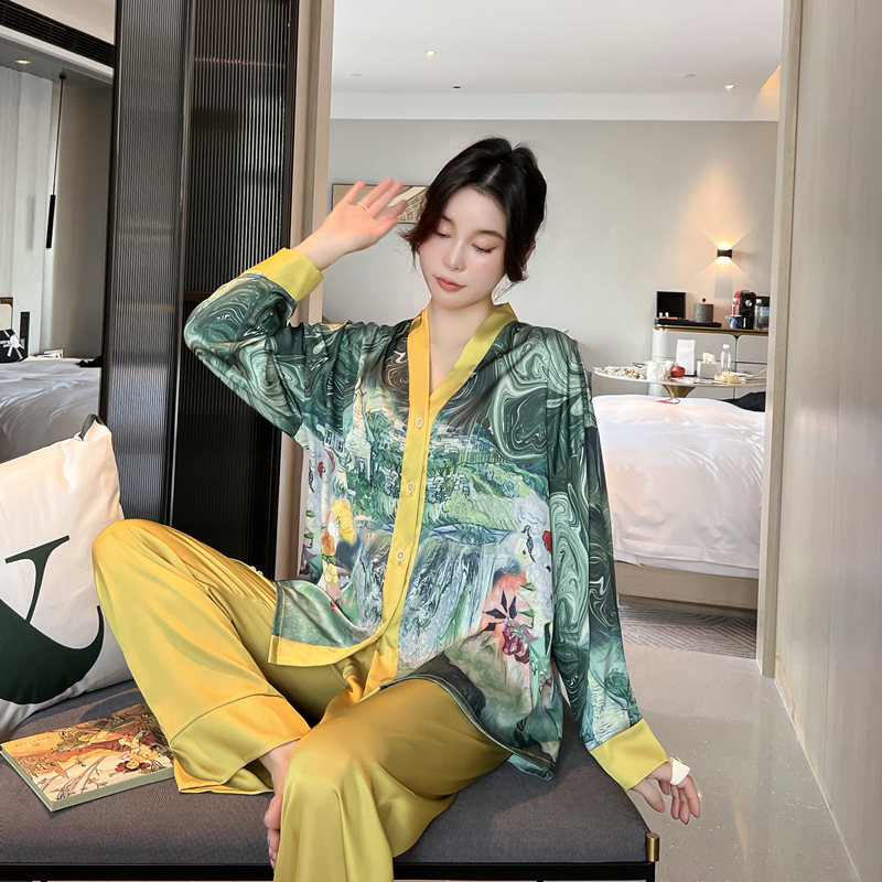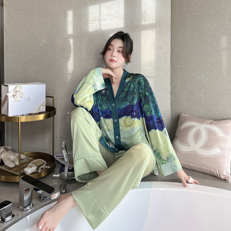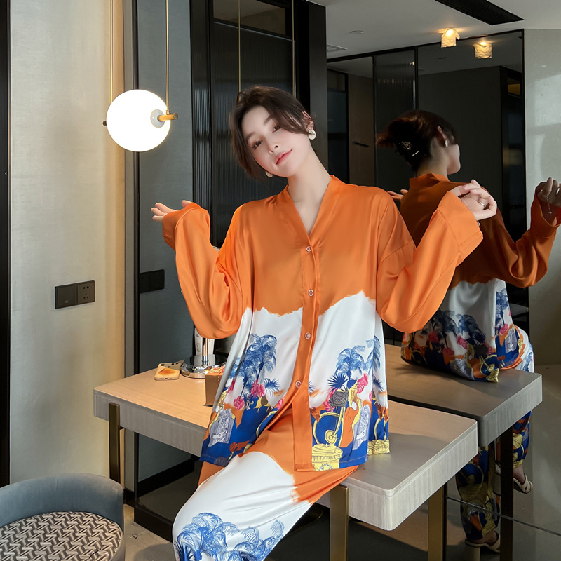 Ice wire pajamas female spring and autumn two long sleeved pants printing suit can be weared outside luxury home suit