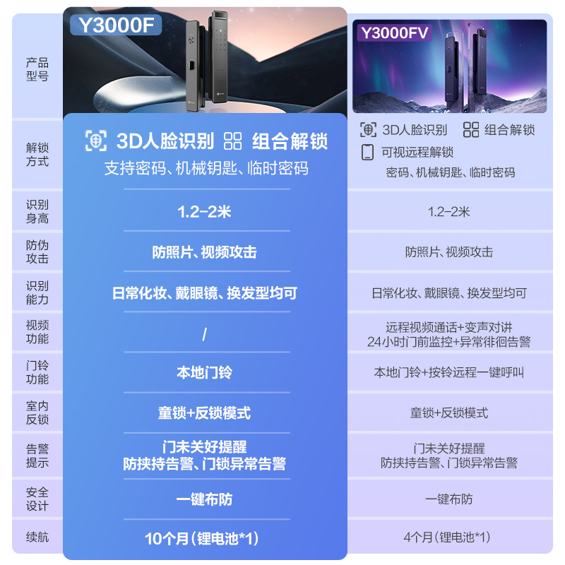 Y3000F extreme ash (face lock without video) Y3000FV extreme ash (face video lock) Y3000FV cryolite purple (face video lock) Y300