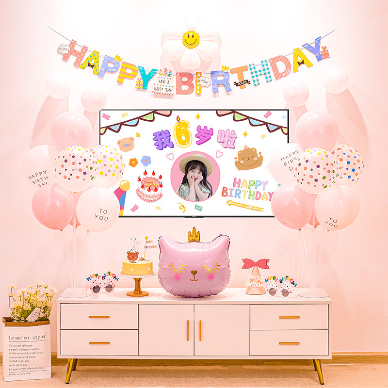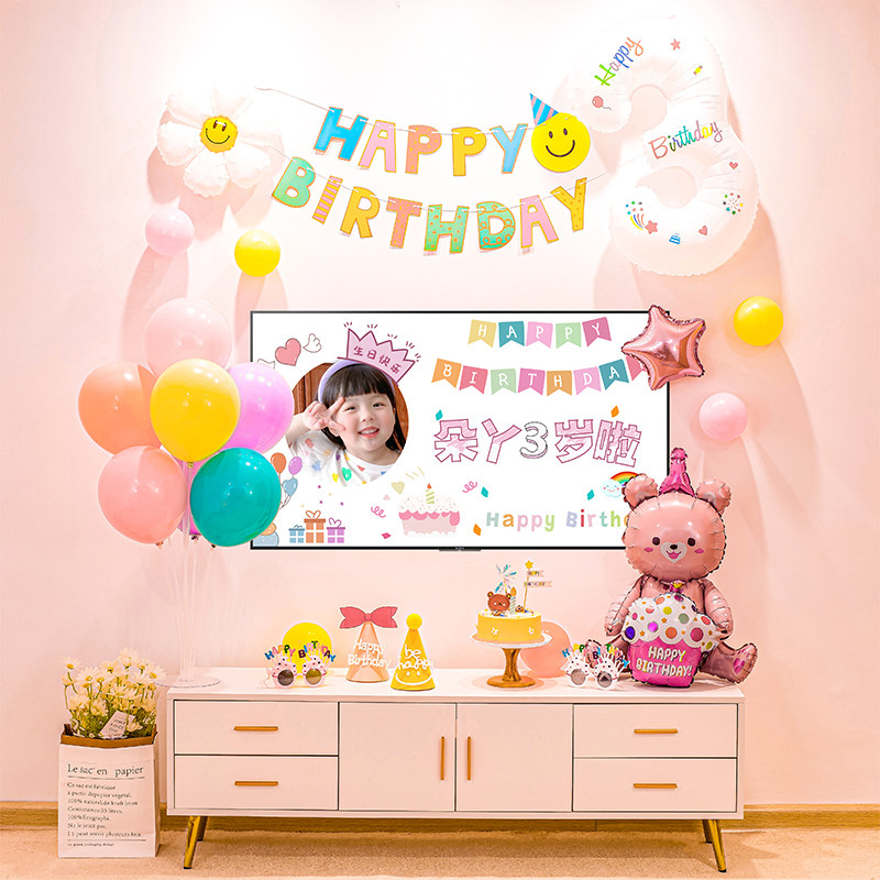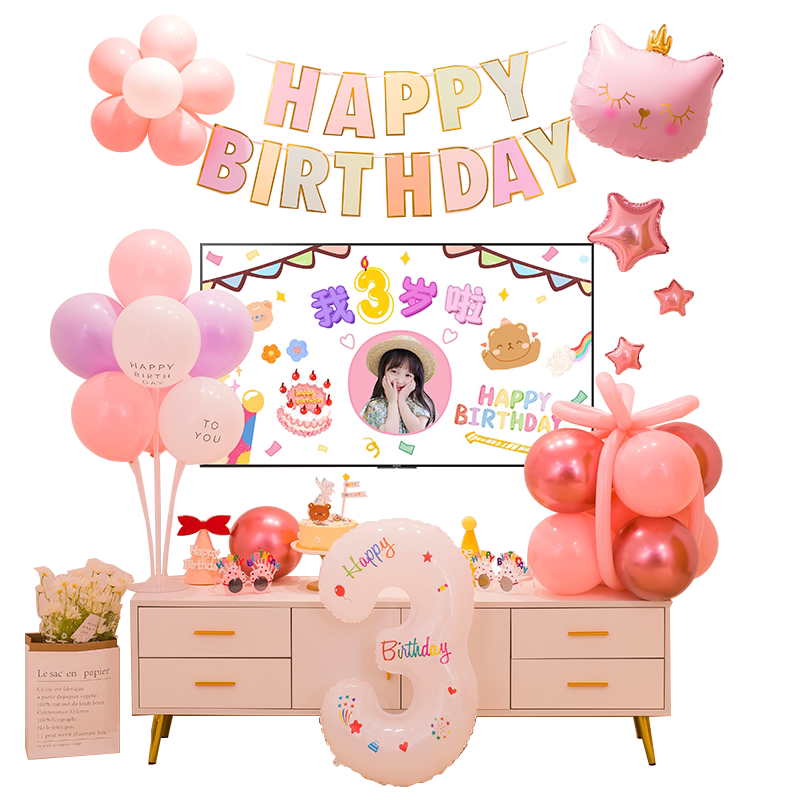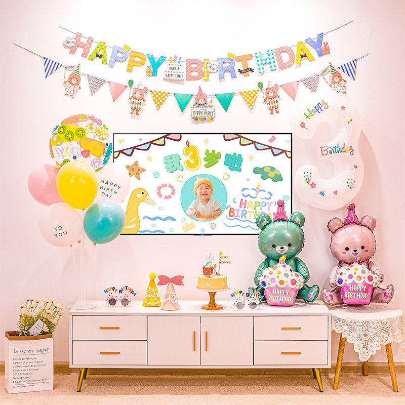 Baby's one-year-old TV screen projection birthday decoration boys and girls children's balloon party scene TV wall decoration