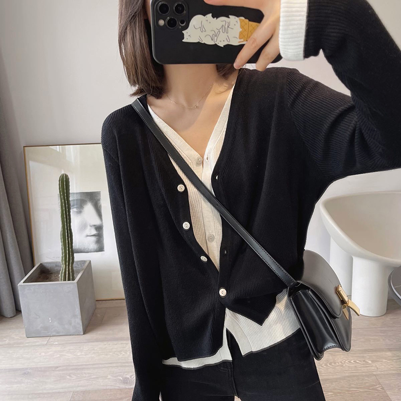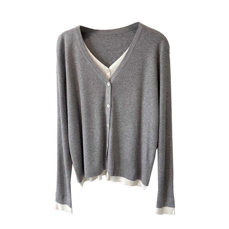 V-neck fine wool knitted cardigan top women's 2022 early autumn French fake two-piece single-breasted long-sleeved sweater jacket