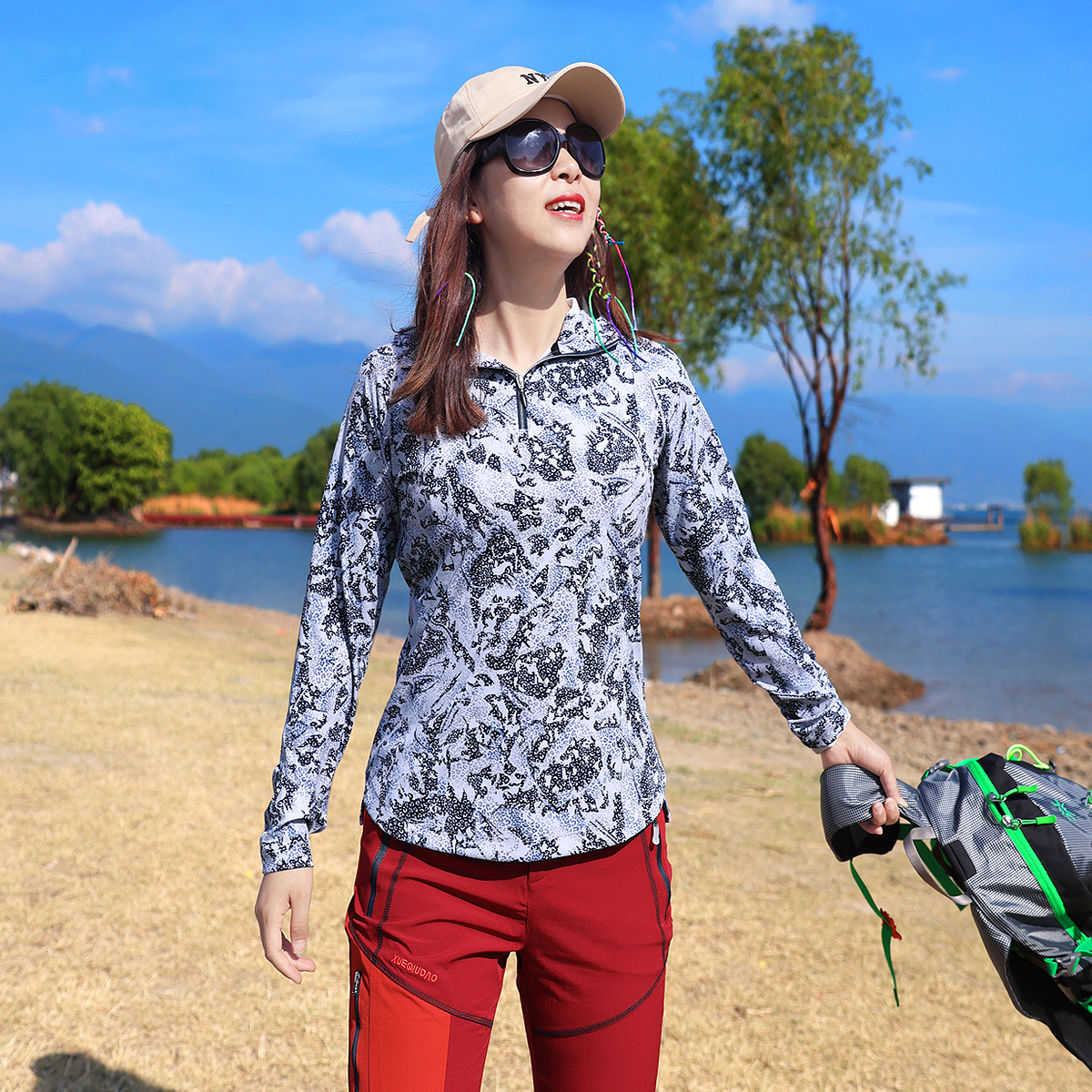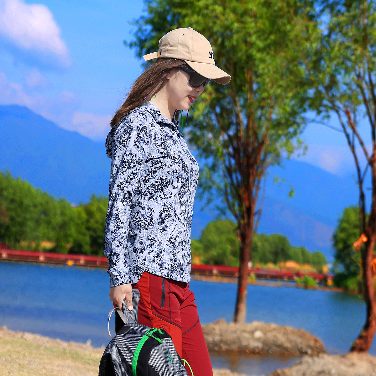 Xueqiu Island outdoor summer new quick-drying hooded stand-up collar print long-sleeved slim fit casual hiking jacket women