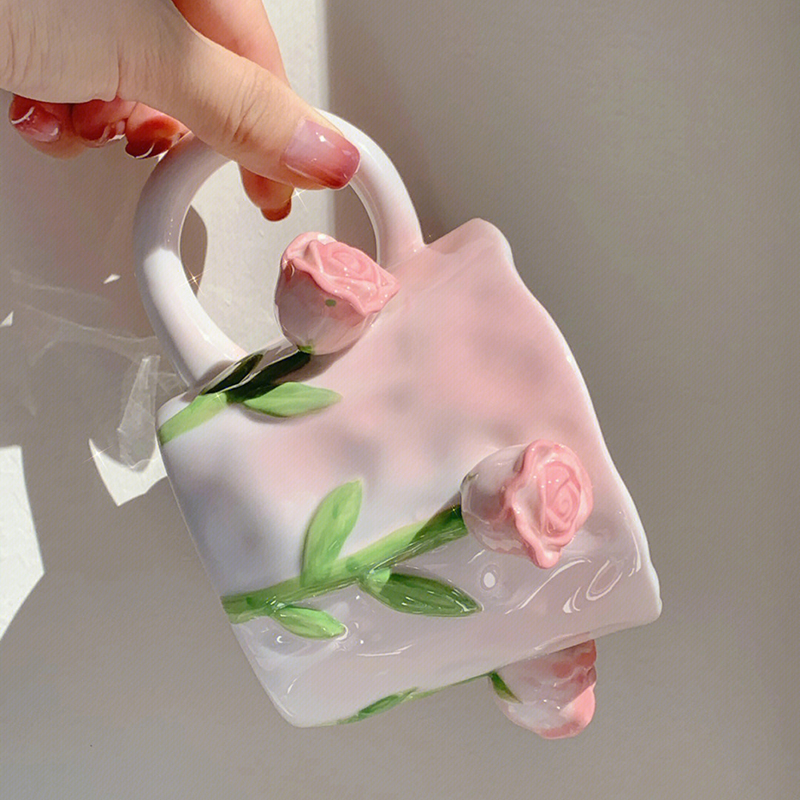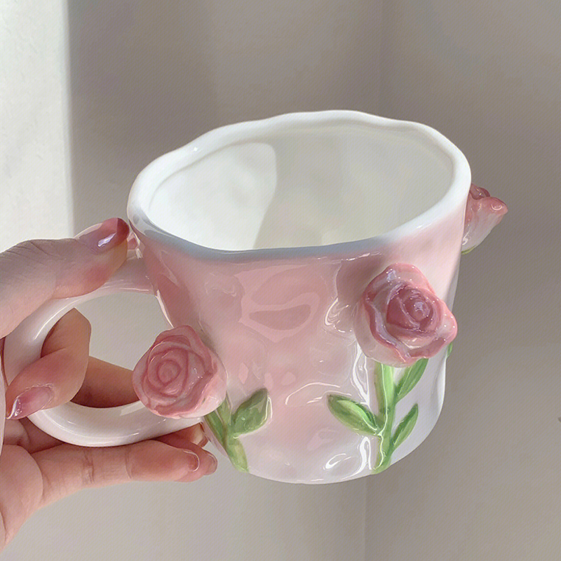 Rose Coffee Cup Ins High Face Value Ceramic Hand-painted Solid Relief Mark Cups Girls Mug Control Tulip-Taobao