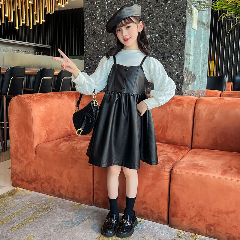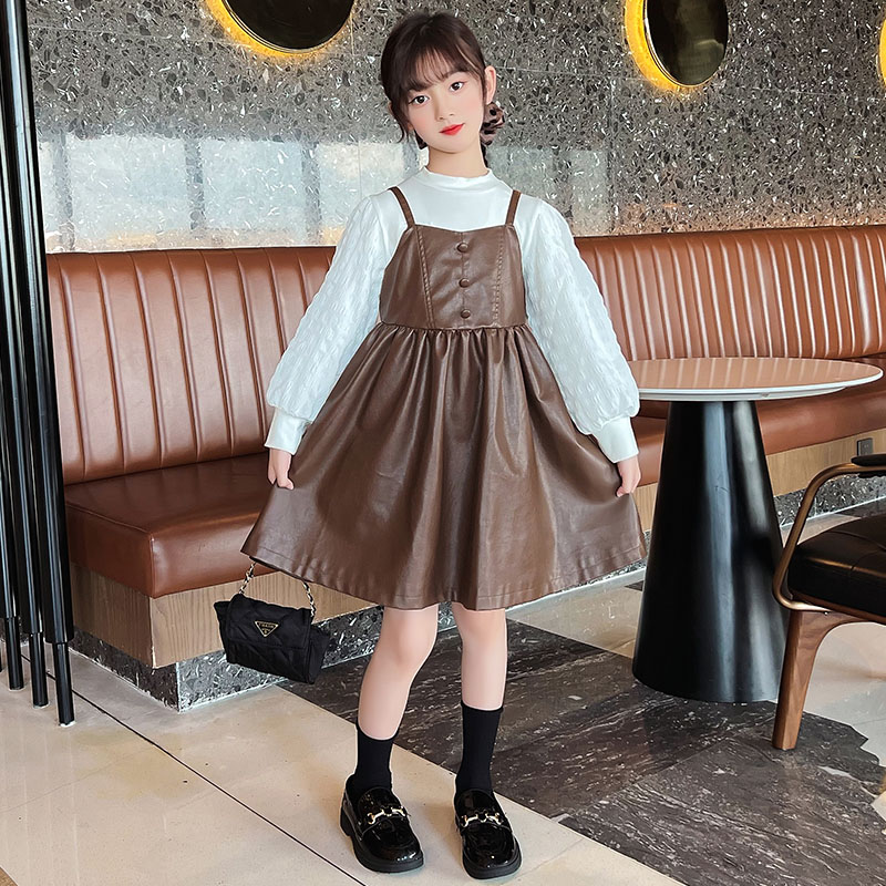 Girl Lian Dress Spring Autumn 2023 New Ocean Gas Trendy Leather Skirt Suit Children Dress Braces Skirt Clothes-Taobao