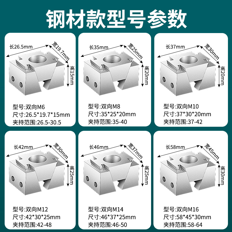 M6 bidirectional steel piece M8 bidirectional steel piece M10 bidirectional steel piece M12 bidirectional steel piece subsection M14 bidirectional steel piece subsection M16 bidirectional steel piece subsection lengthened OK clamp (M6) bidirectional