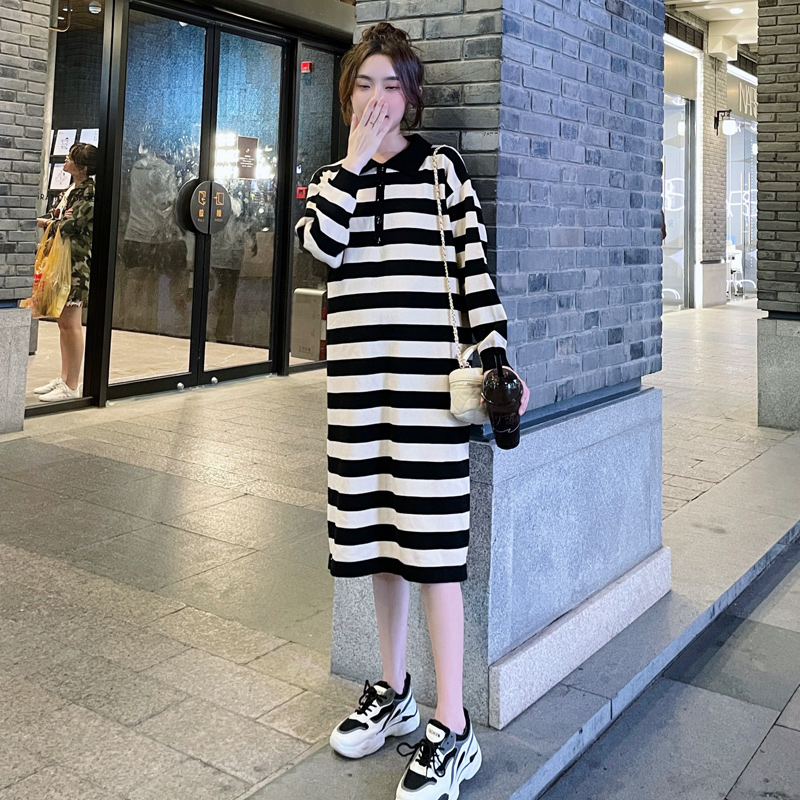 Maternity wear 2022 autumn and winter new Korean version knitted skirt polo striped dress long skirt age-reducing sweater skirt autumn