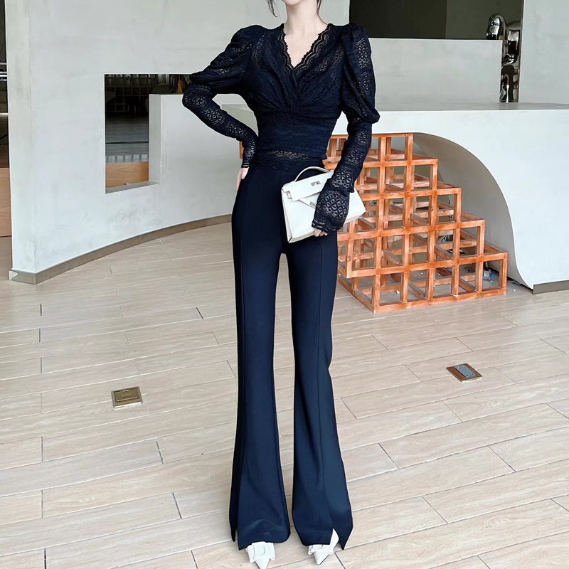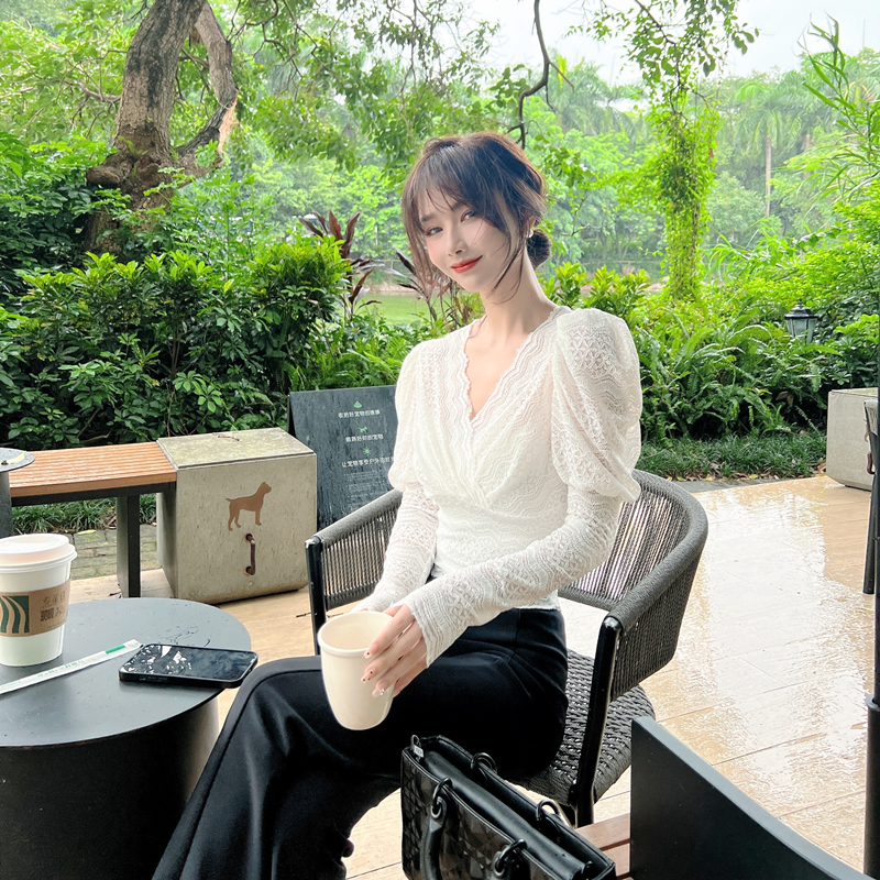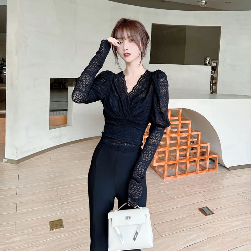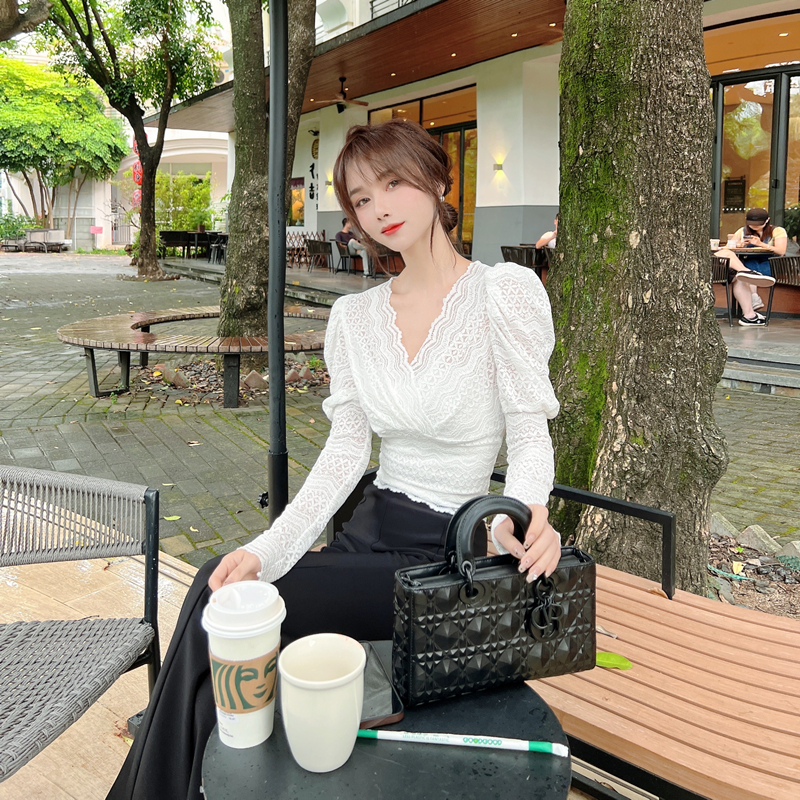 Kaka women's official flagship early autumn French V-collar lace long sleeve shirt with a blouse