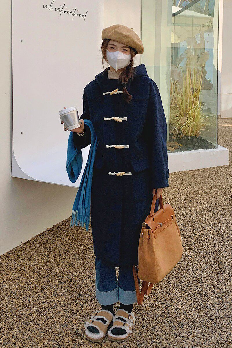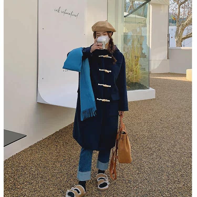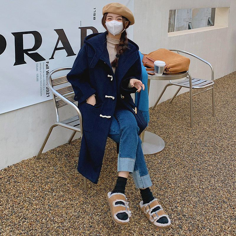 Monica's summer winter college navy blue horn button coat women's mid-length hooded wool coat