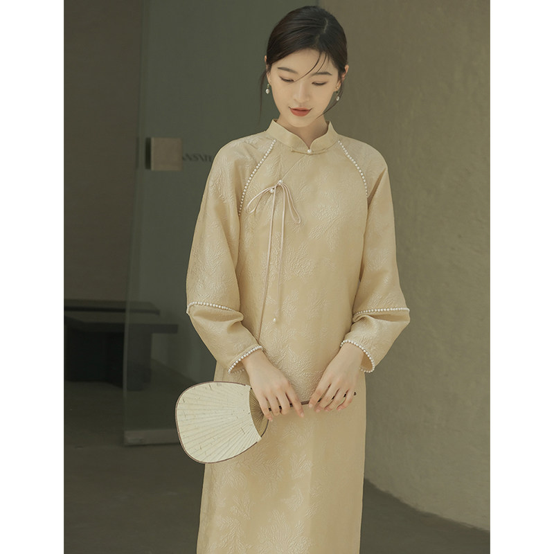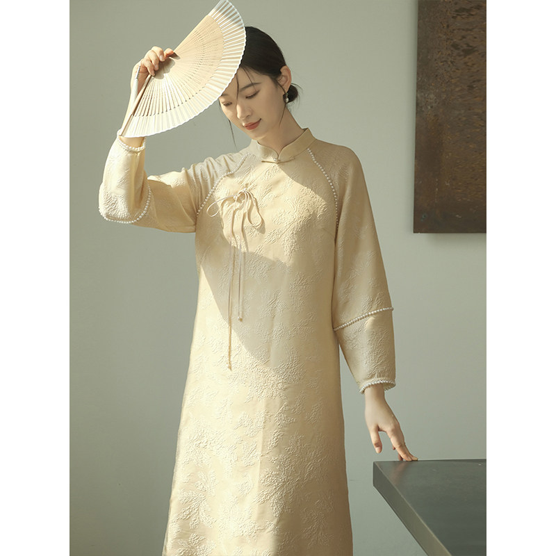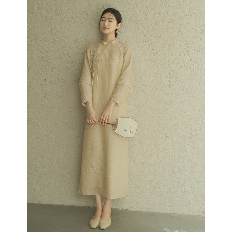 Mountain Colored Spring Summer New Chinese Style National Wind Female Tea Suit Genuine Silk Jacquard Tray Button Long Sleeves Zen to improve the qipao dress-Taobao
