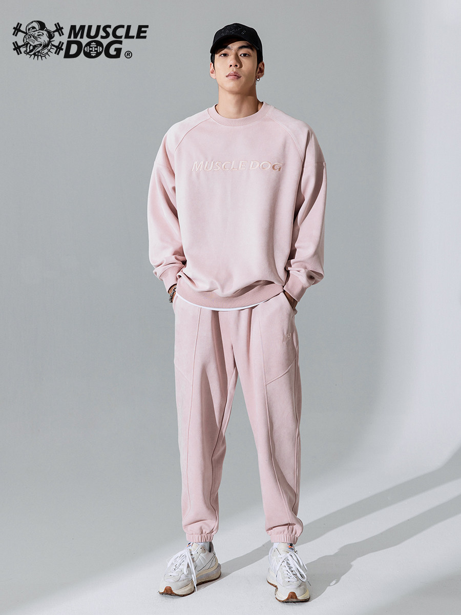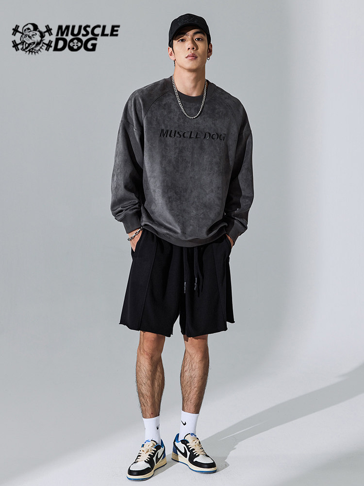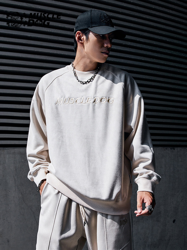 Muscle dog sports round neck sweater men's trendy brand spring and autumn new suede loose long-sleeved pullover fitness clothes