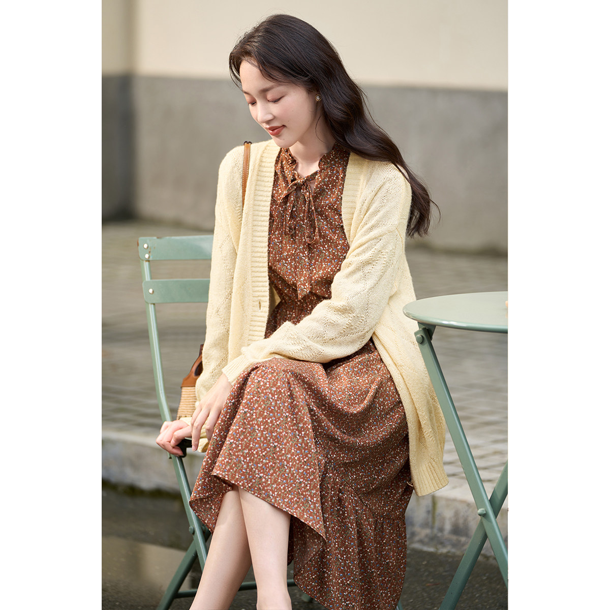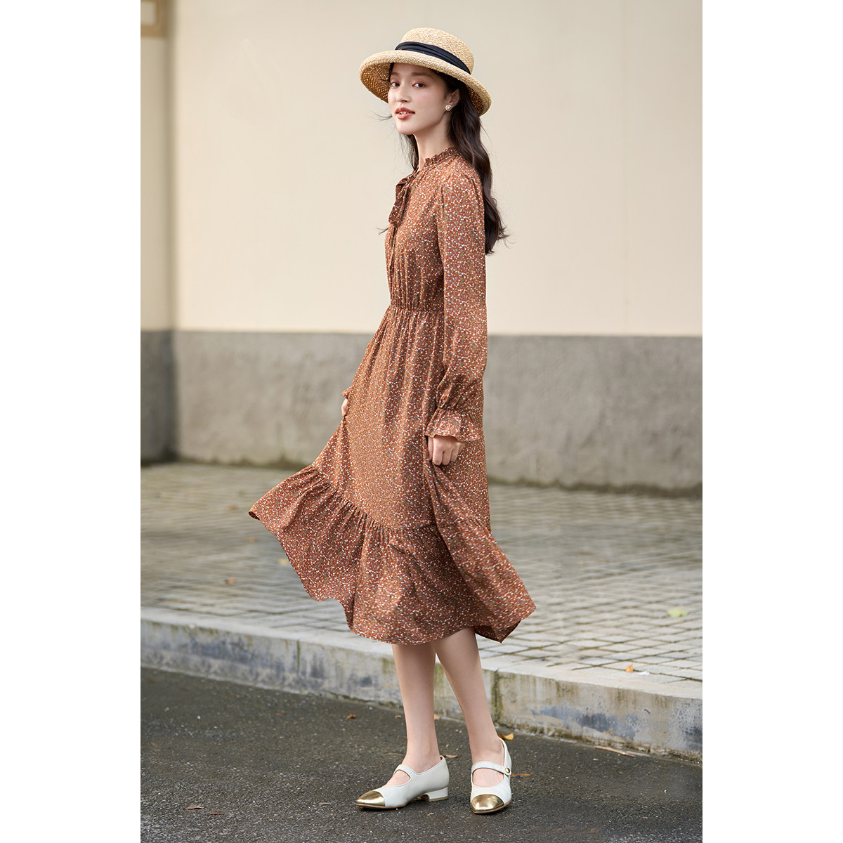 Inman French Vintage Floral Long Sleeve Dress Women's Fall 2022 New Slim Ties Chiffon A-Line Skirt