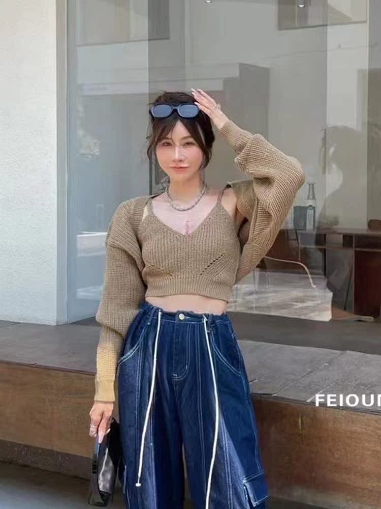 Korean version of knitted two-piece suit female sexy small man all-match 2022 autumn hot girl camisole long-sleeved cardigan suit