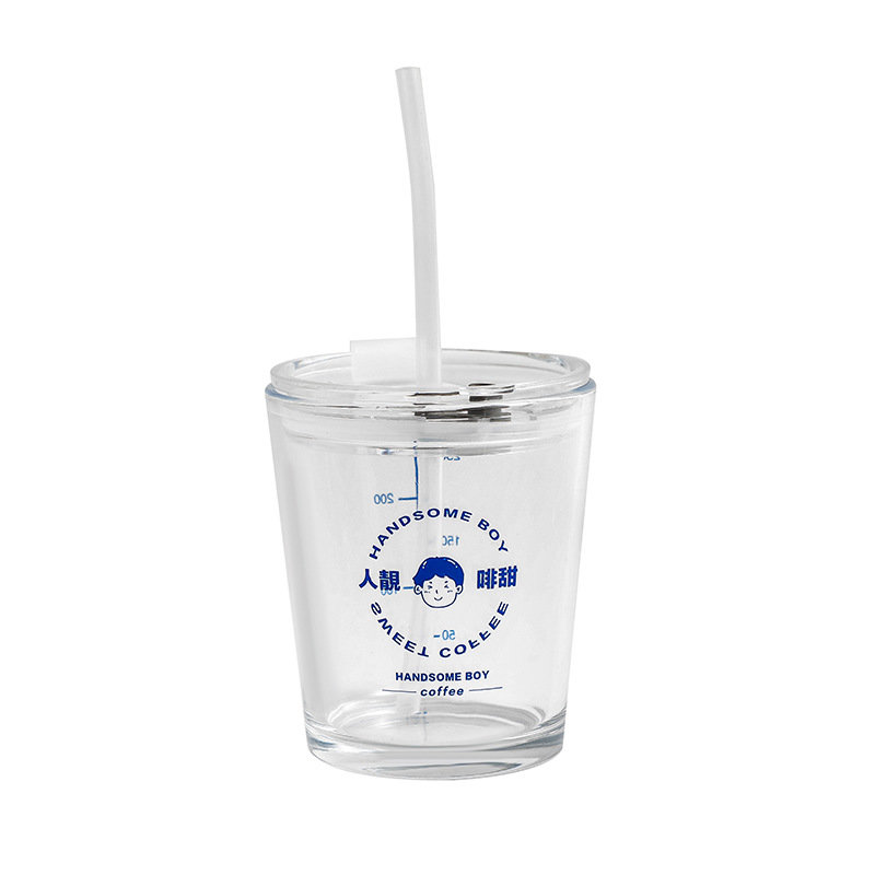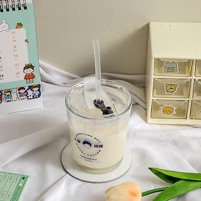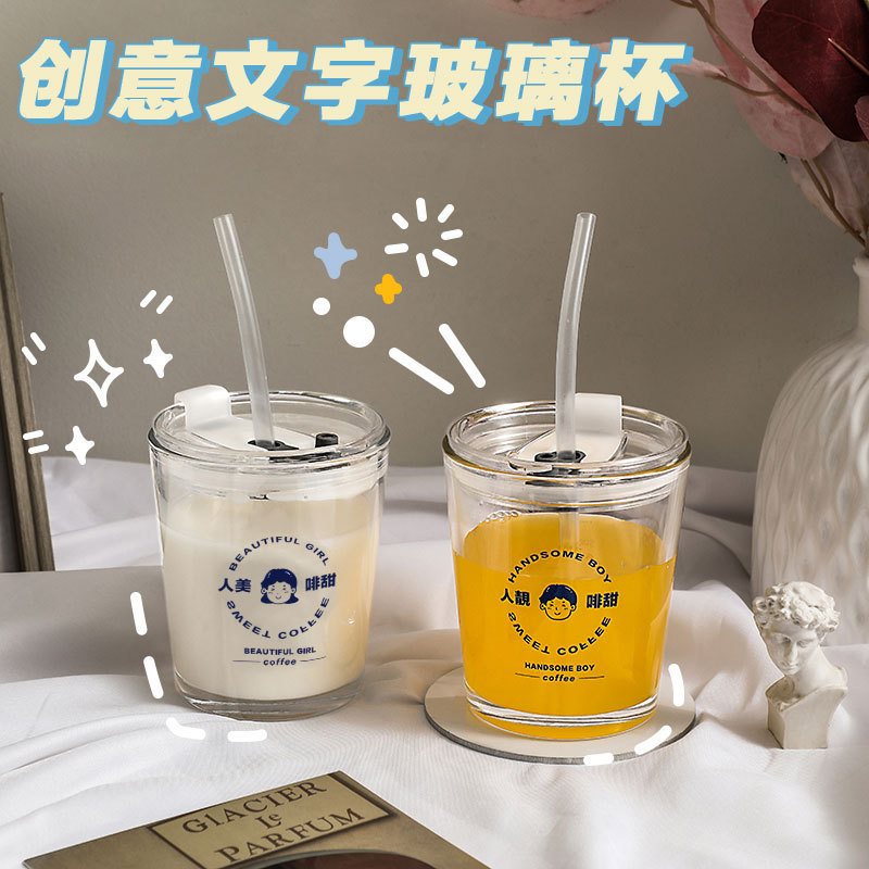 Double-layer glass girl cute with straw creative INS people beauty coffee sweet coffee cup text net red cute