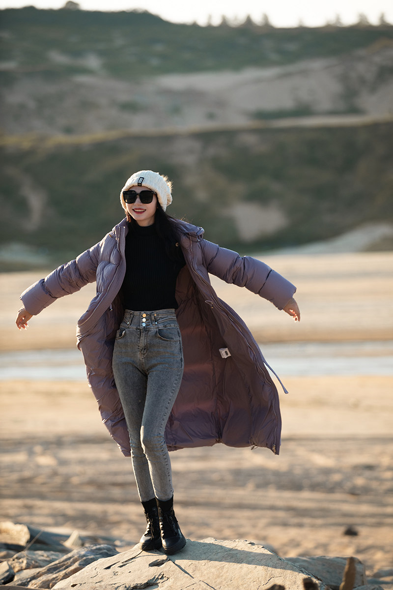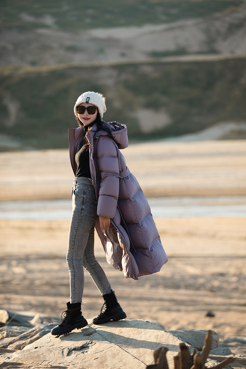 Yuwu 2022 long section 95 peace of mind white goose down light purple waist belt slimming down jacket women's hooded